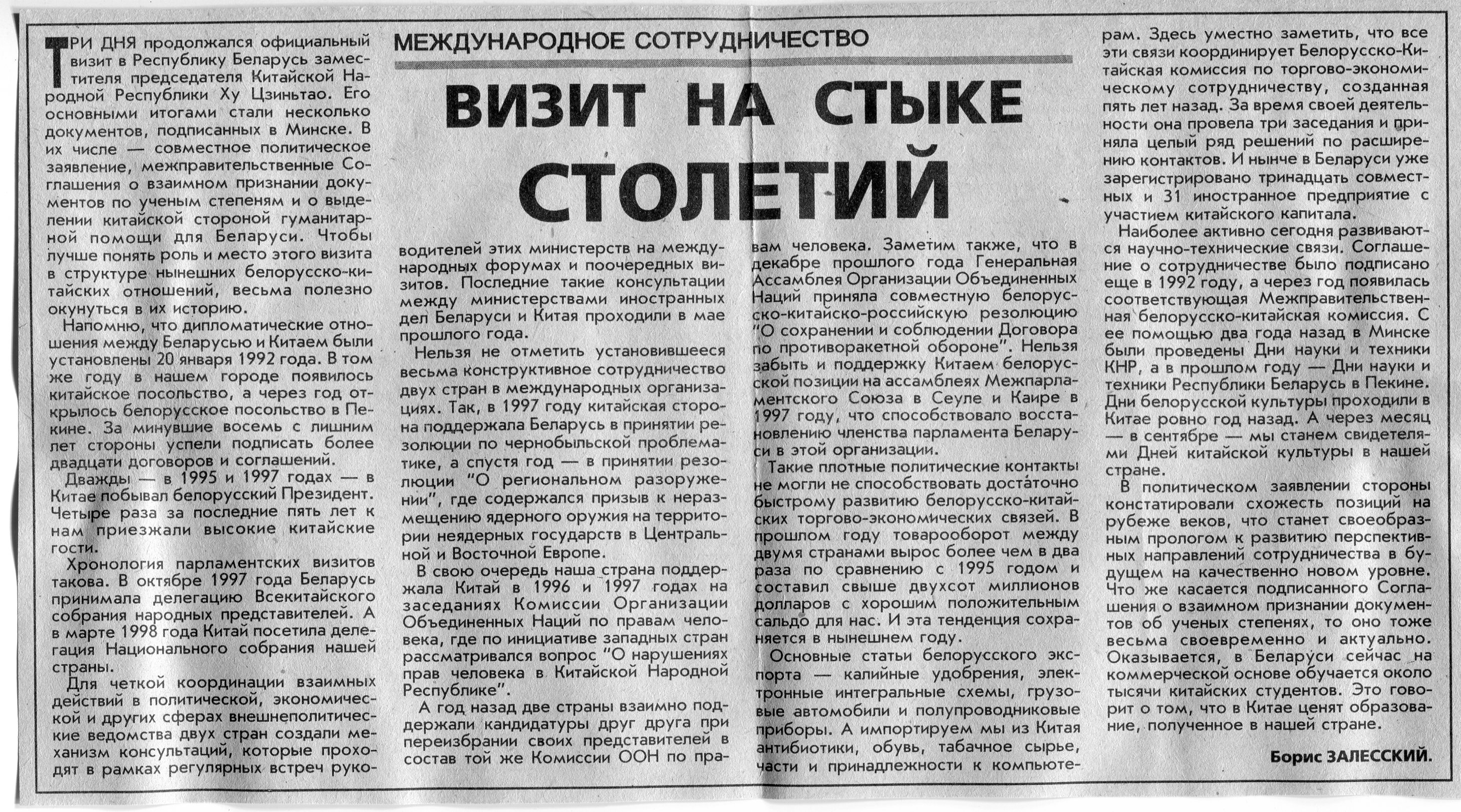 Залесский, Б. Визит на стыке столетий / Б. Залесский // Вечерний Минск. - 2000. - 28 июл.