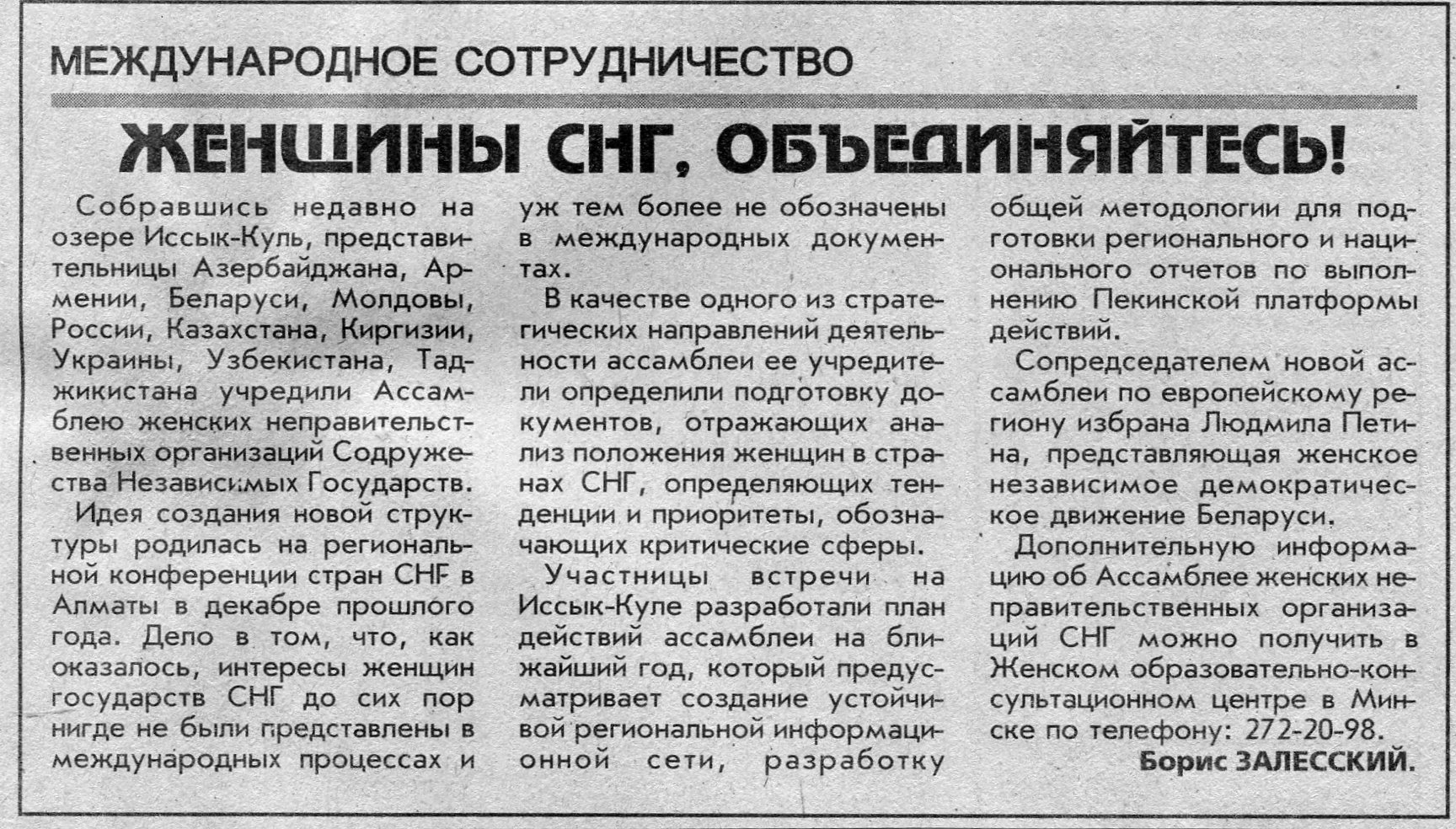 Залесский, Б. Женщины СНГ, объединяйтесь! / Б. Залесский // Вечерний Минск. - 2000. - 19 июл.