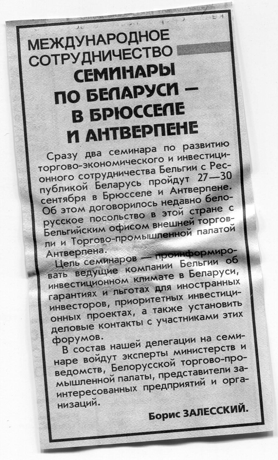 Залесский, Б. Семинары по Беларуси - в Брюсселе и Антверпене / Б. Залесский // Вечерний Минск. - 1999. - 19 авг.