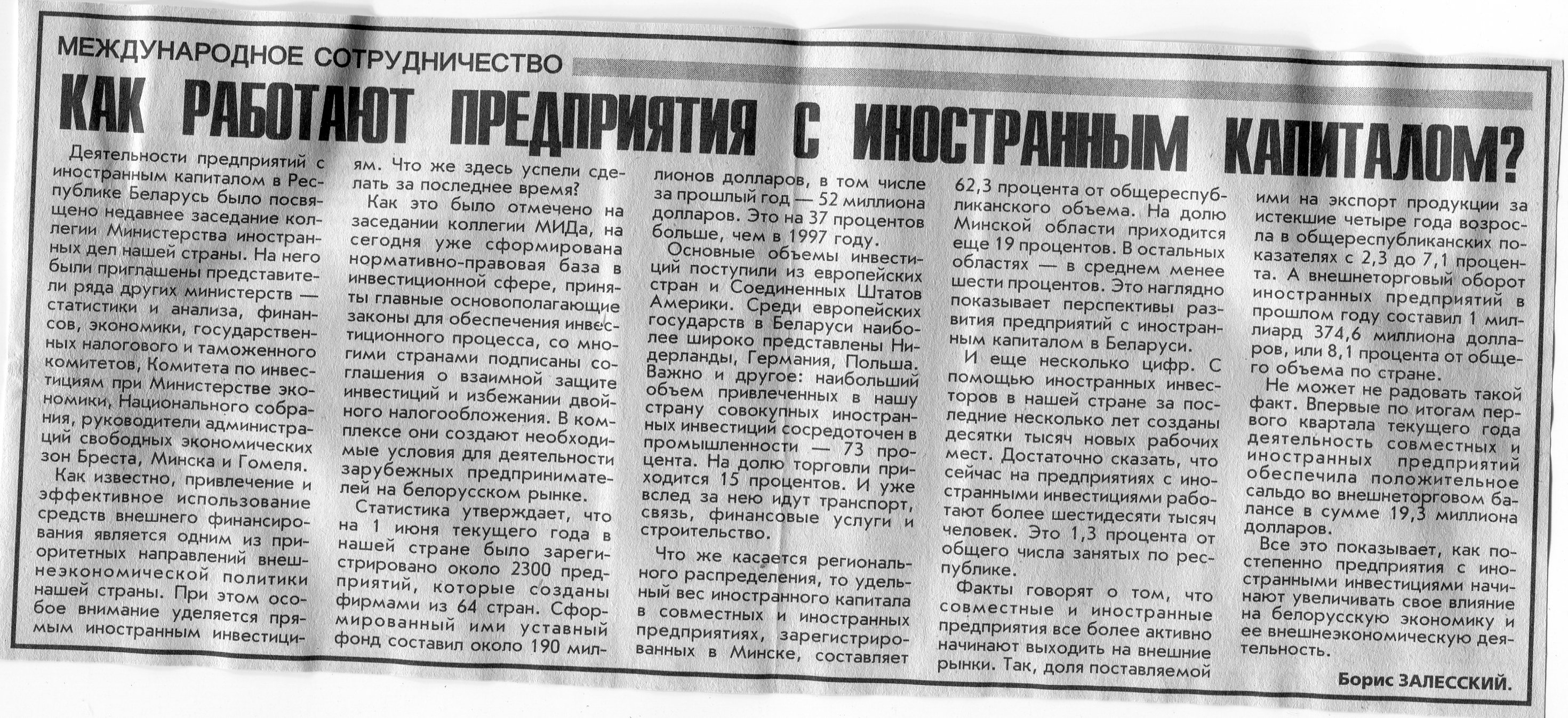 Залесский, Б. Как работают предприятия с иностранным капиталом? / Б. Залесский // Вечерний Минск. - 1999. - 29 июл.