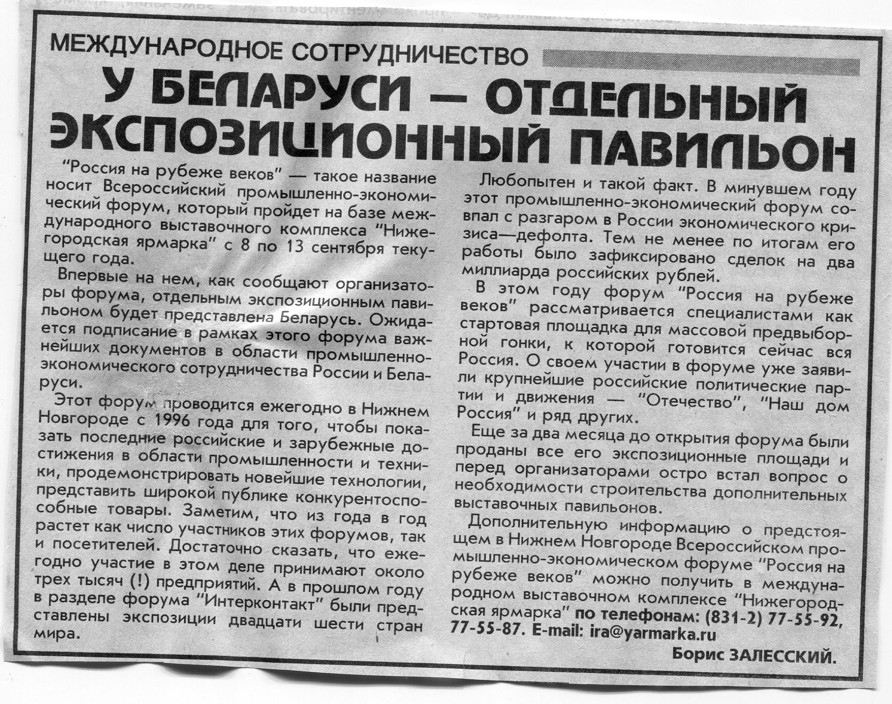 Залесский, Б. У Беларуси - отдельный экспозиционный павильон / Б. Залесский // Вечерний Минск. - 1999. - 13 авг.