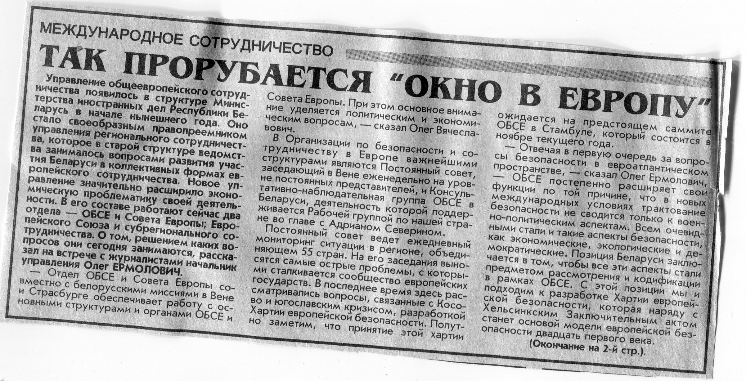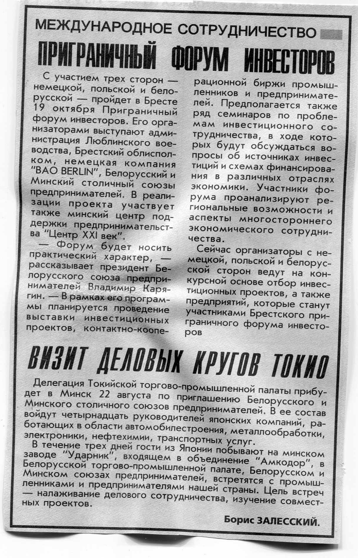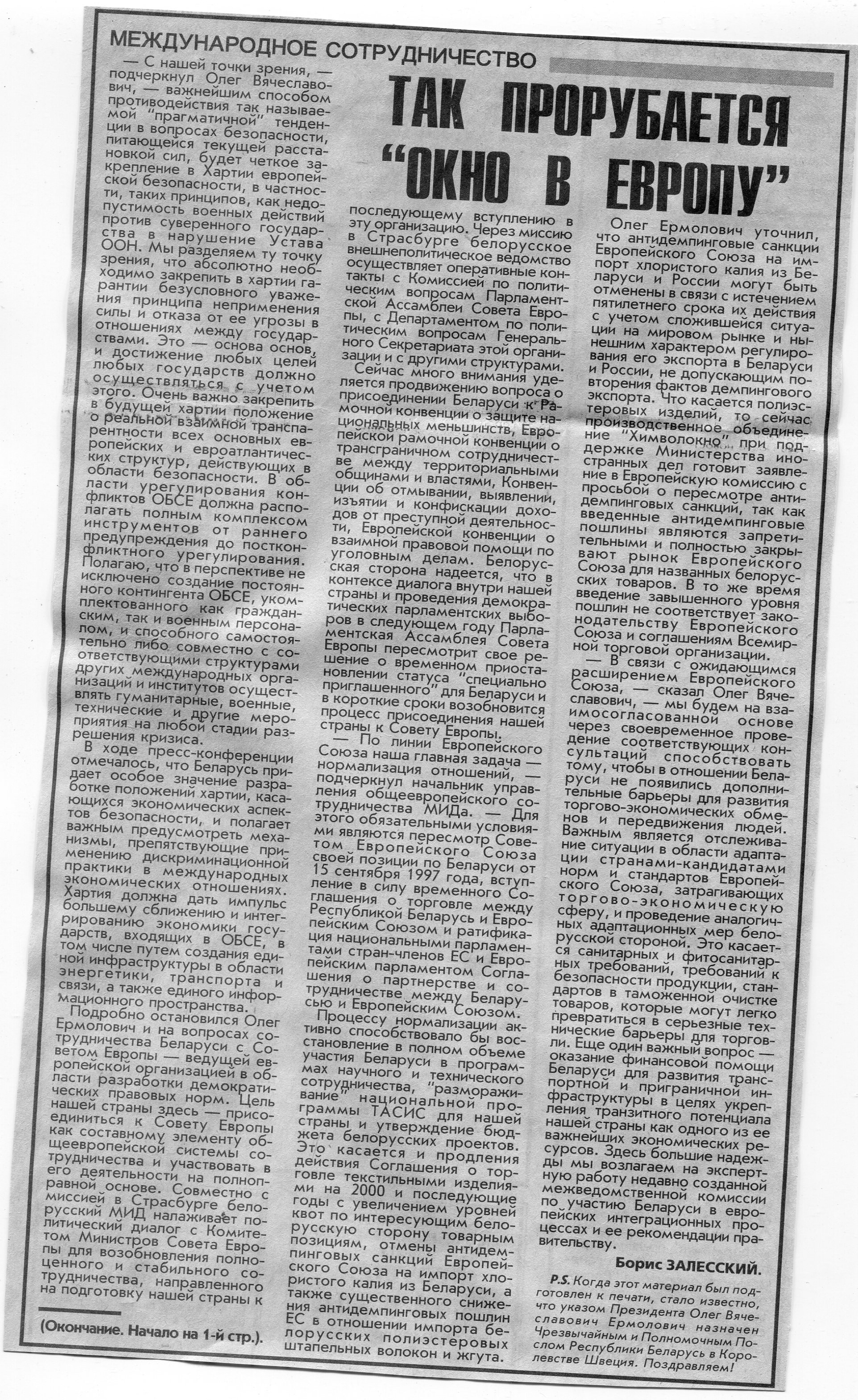 Залесский, Б. Так прорубается "окно в Европу"" / Б. Залесский // Вечерний Минск. - 1999. - 10 сент. - С.1.