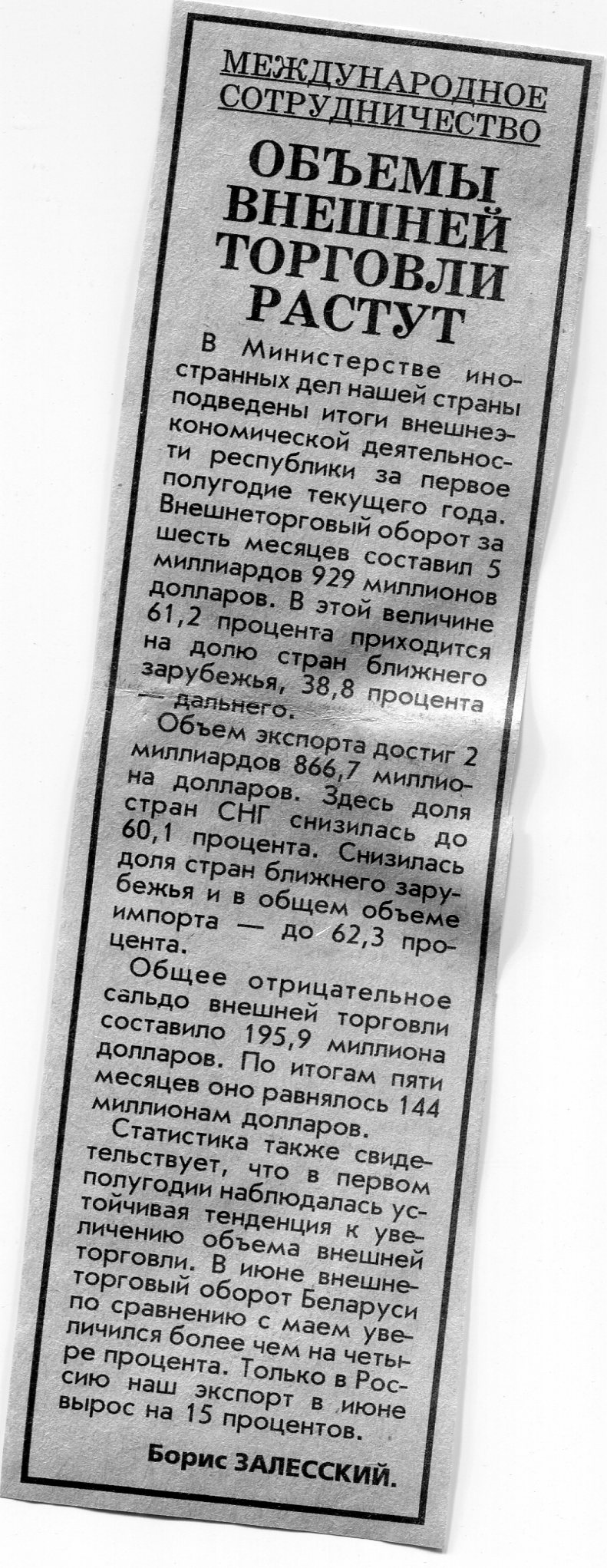 Залесский, Б. Объемы внешней торговли растут / Б. Залесский // Вечерний Минск. - 1999. - 2 авг.