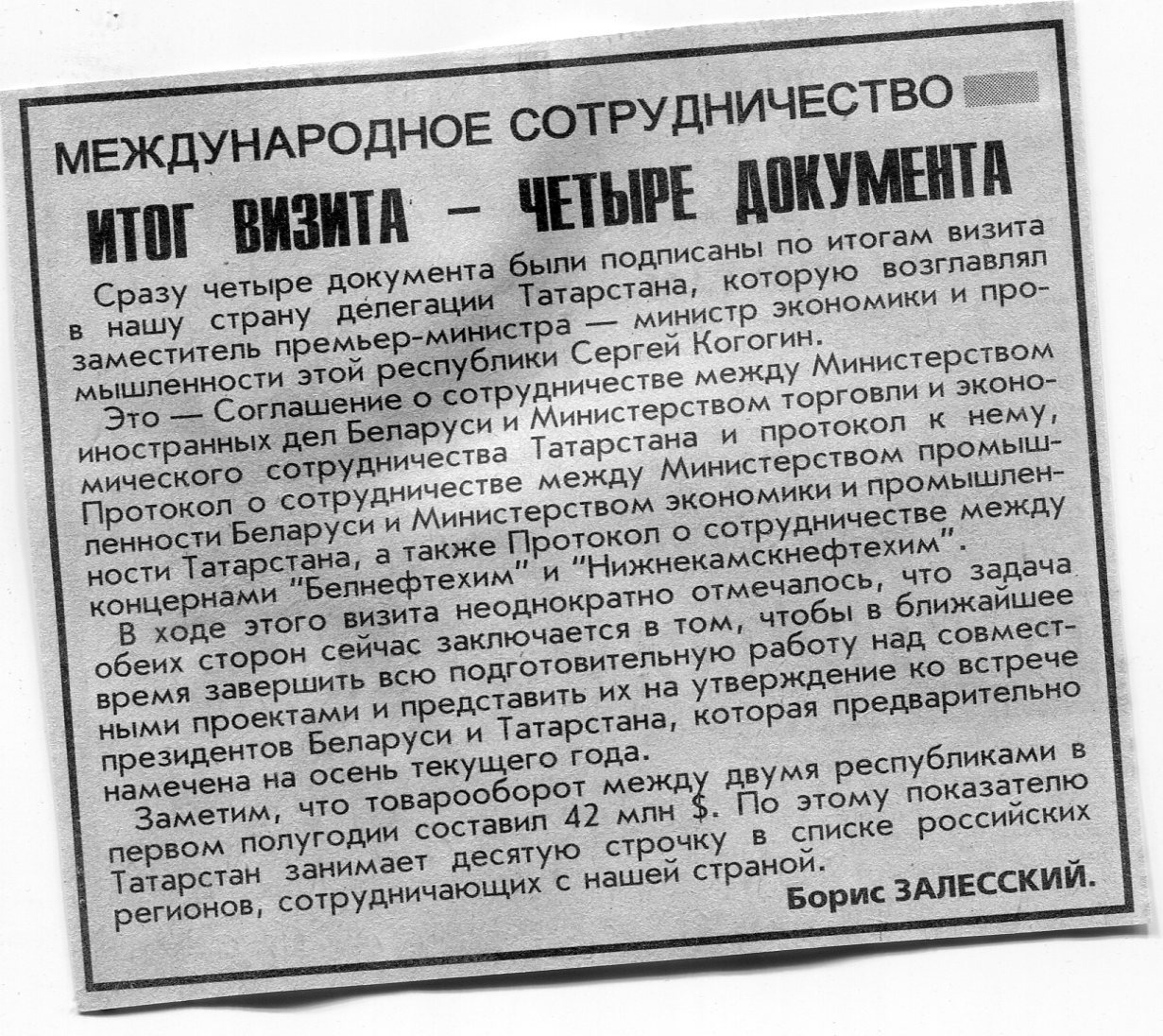 Залесский, Б. Итог визита - четыре документа / Б. Залесский // Вечерний Минск. - 1999. - 23 авг.