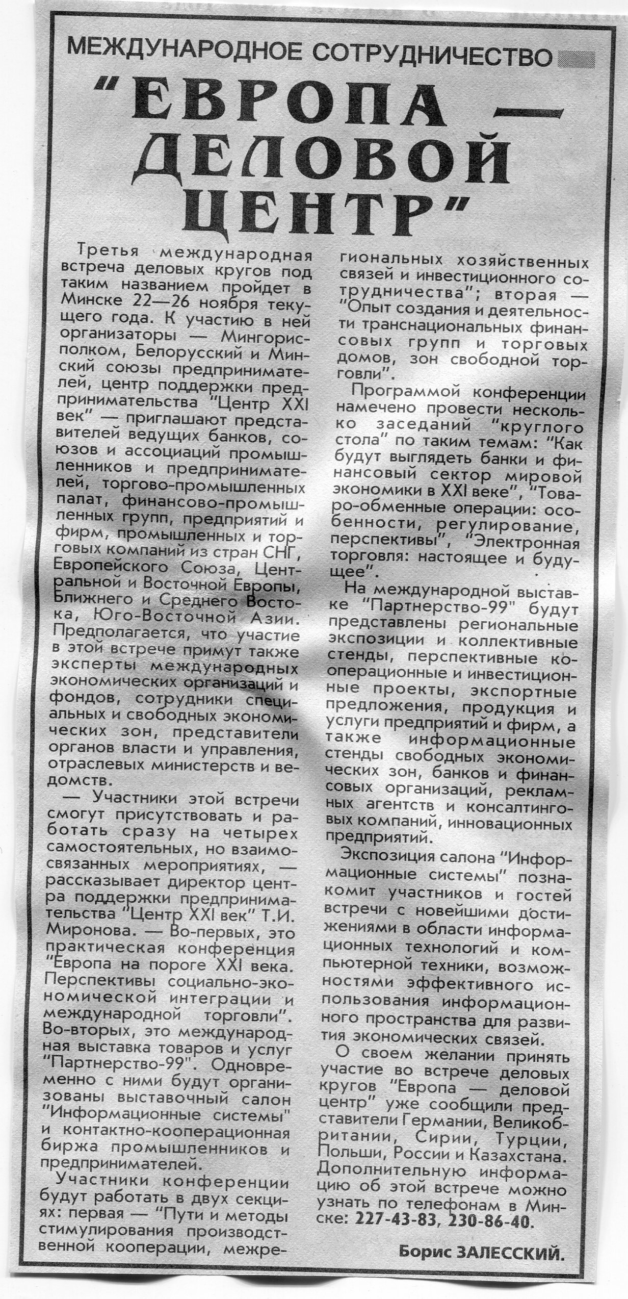 Залесский, Б. "Европа - деловой центр" / Б. Залесский // Вечерний Минск. - 1999. - 5 авг.