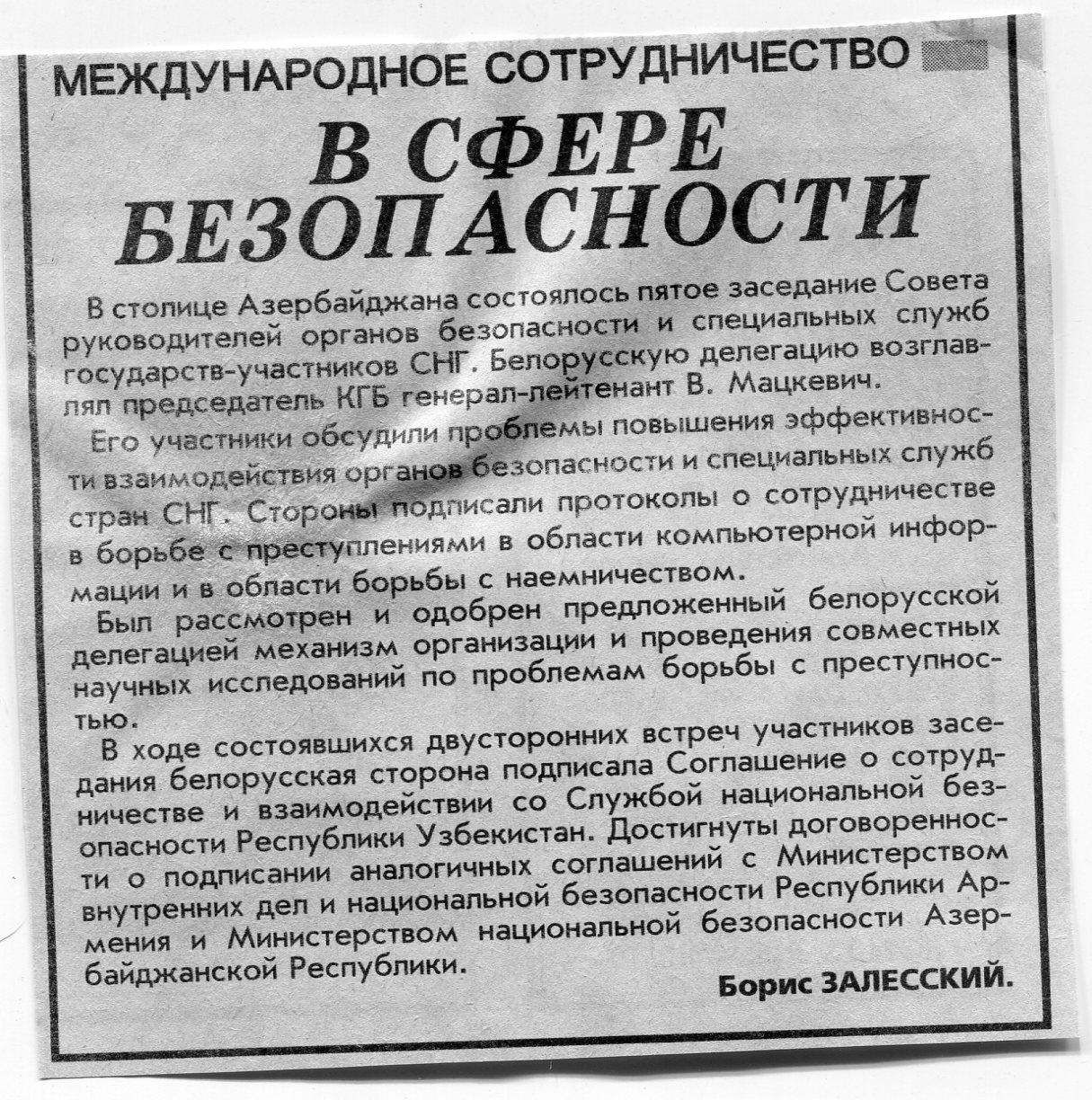 Залесский, Б. В сфере безопасности / Б. Залесский // Вечерний Минск. - 1999. - 16 июн.