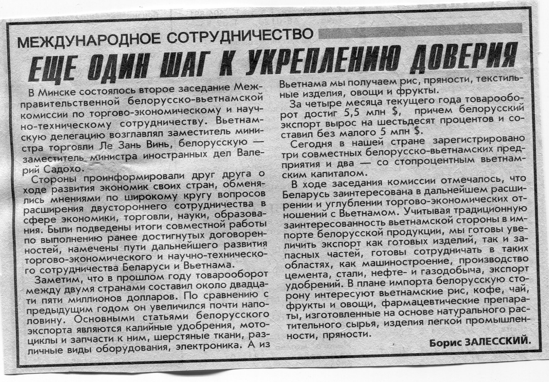 Залесский, Б. Еще один шаг к укреплению доверия / Б. Залесский // Вечерний Минск. - 1999. - 7 июл.