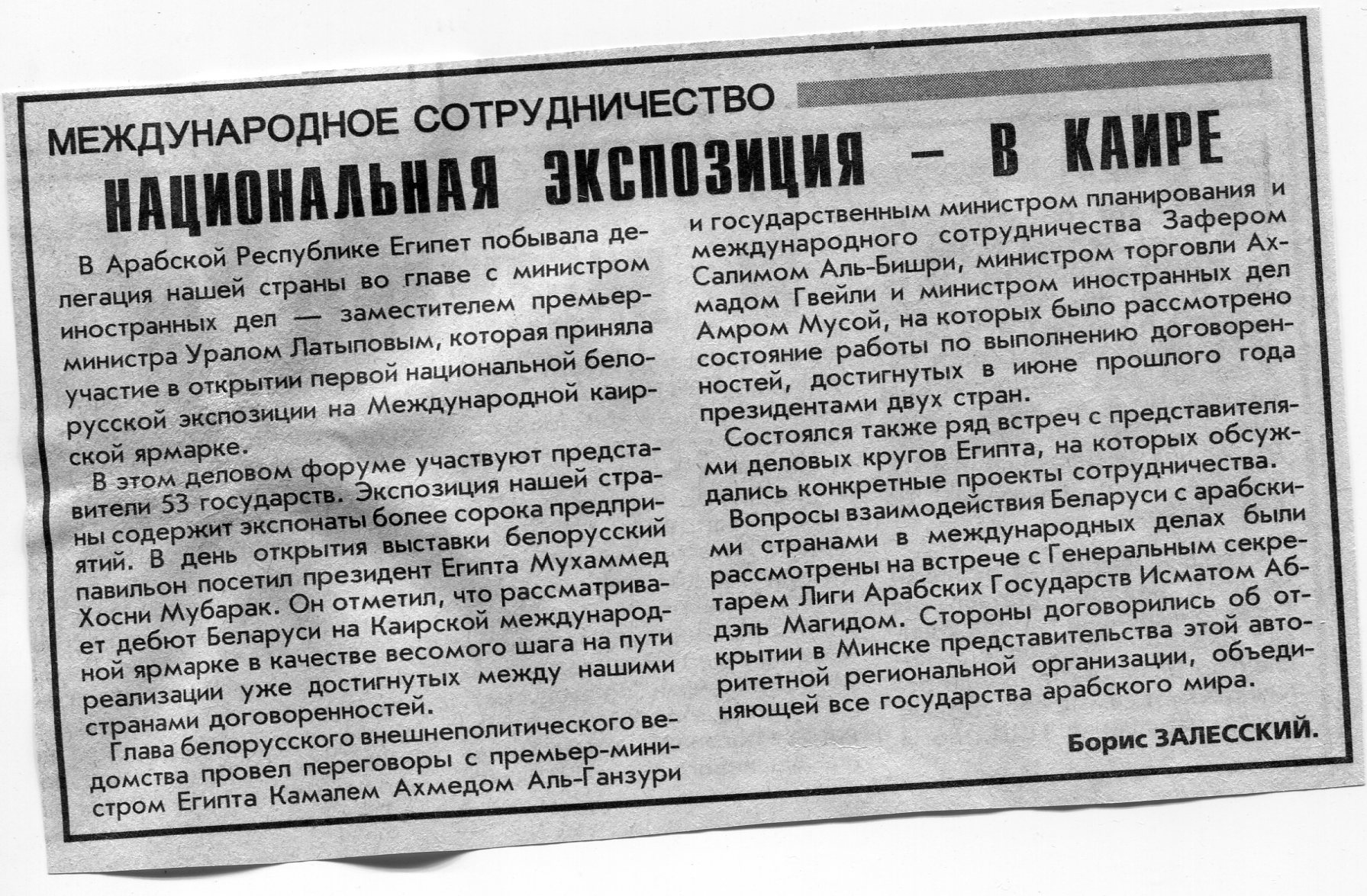 Залесский, Б. Национальная экспозиция - в Каире / Б. Залесский // Вечерний Минск. - 1999. - 17 мар.