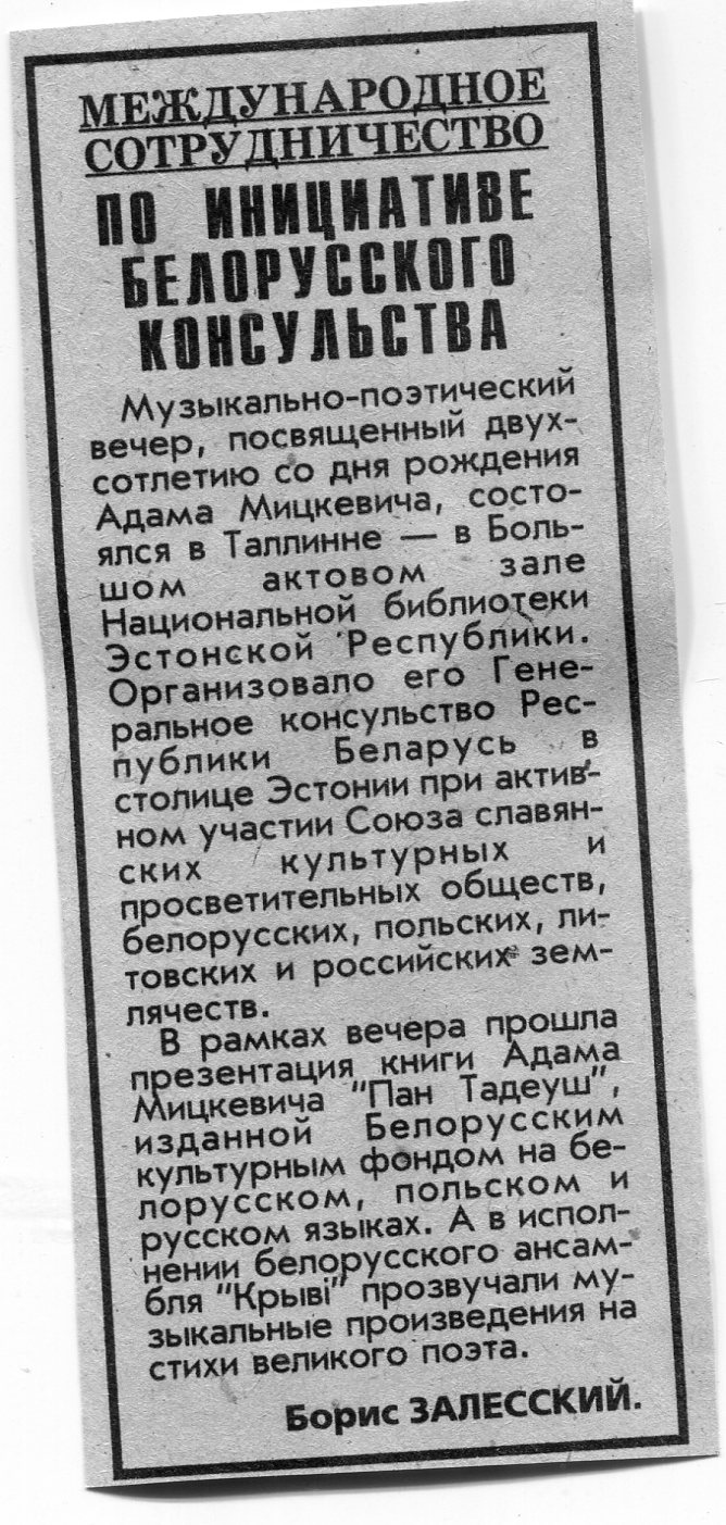 Залесский, Б. По инициативе белорусского консульства / Б. Залесский // Вечерний Минск. - 1998. - 30 дек.