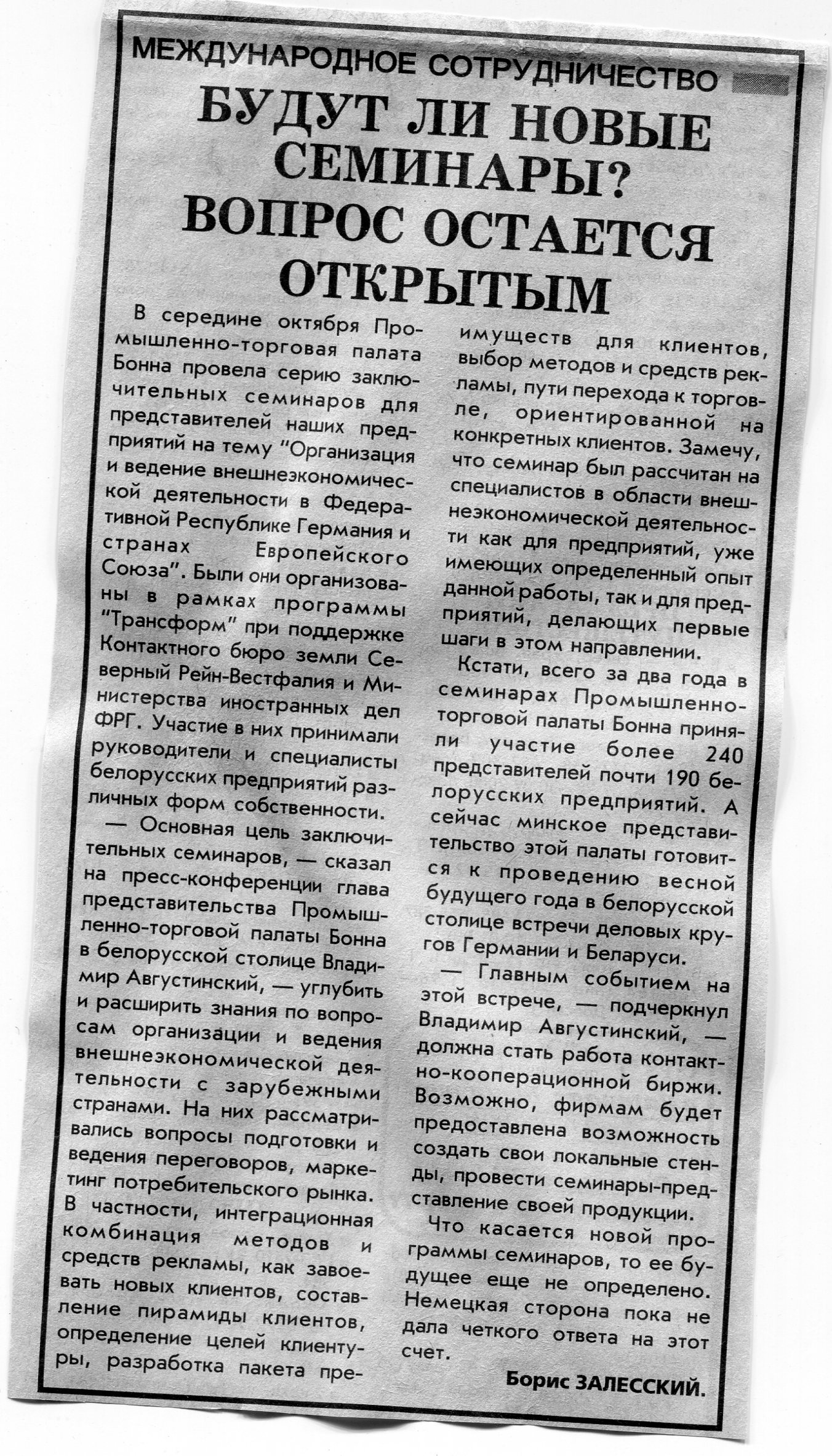 Залесский, Б. Будут ли новые семинары? Вопрос остается открытым / Б. Залесский // Вечерний Минск. - 1998. - 3 нояб.