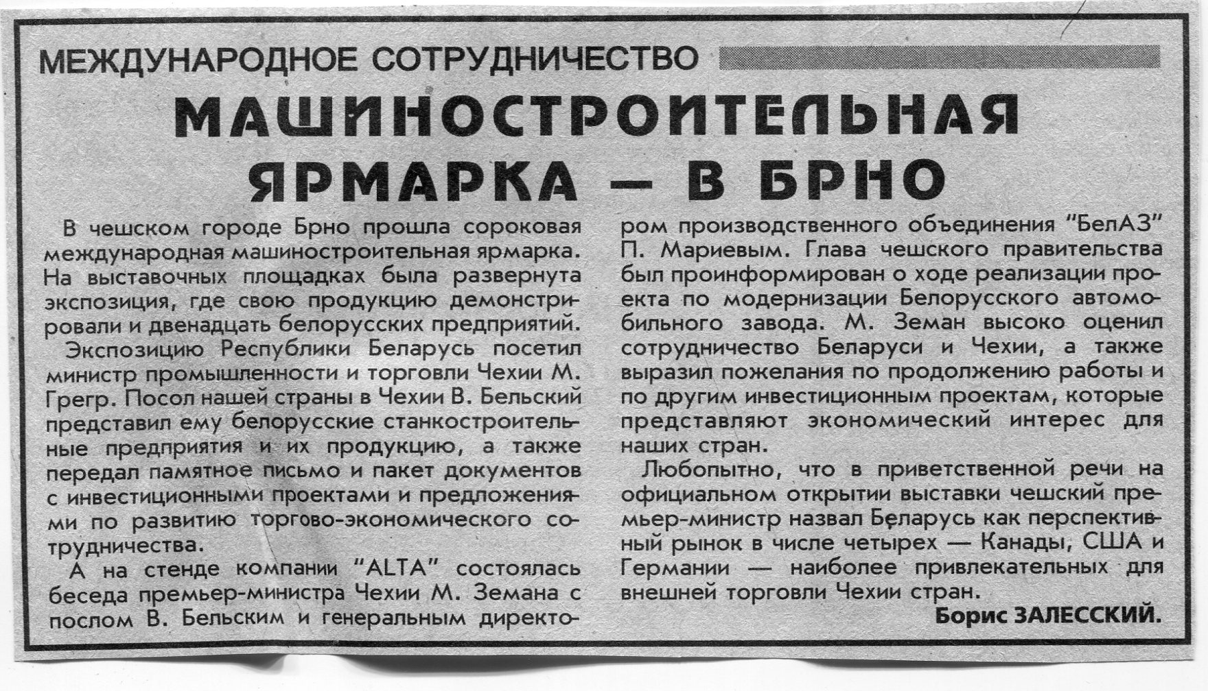 Залесский, Б. Машиностроительная ярмарка - в Брно / Б. Залесский // Вечерний Минск. - 1998. - 5 нояб.