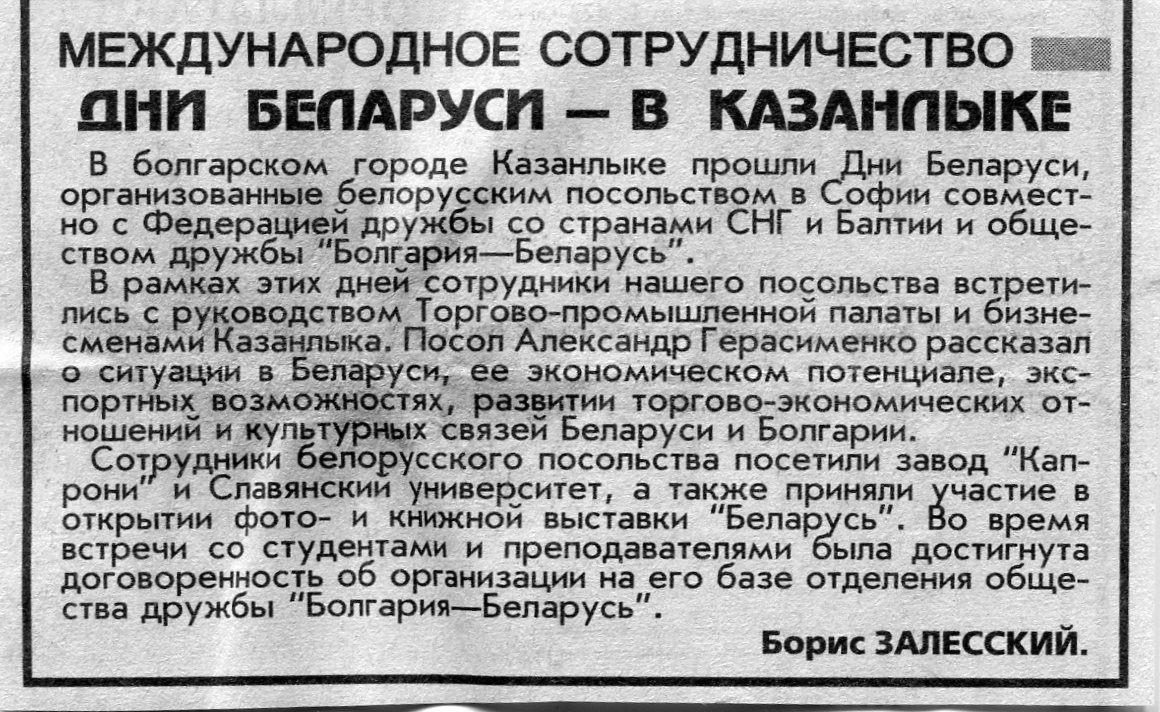 Залесский, Б. Дни Беларуси - в Казанлыке / Б. Залесский // Вечерний Минск. - 1998. - 22 дек.