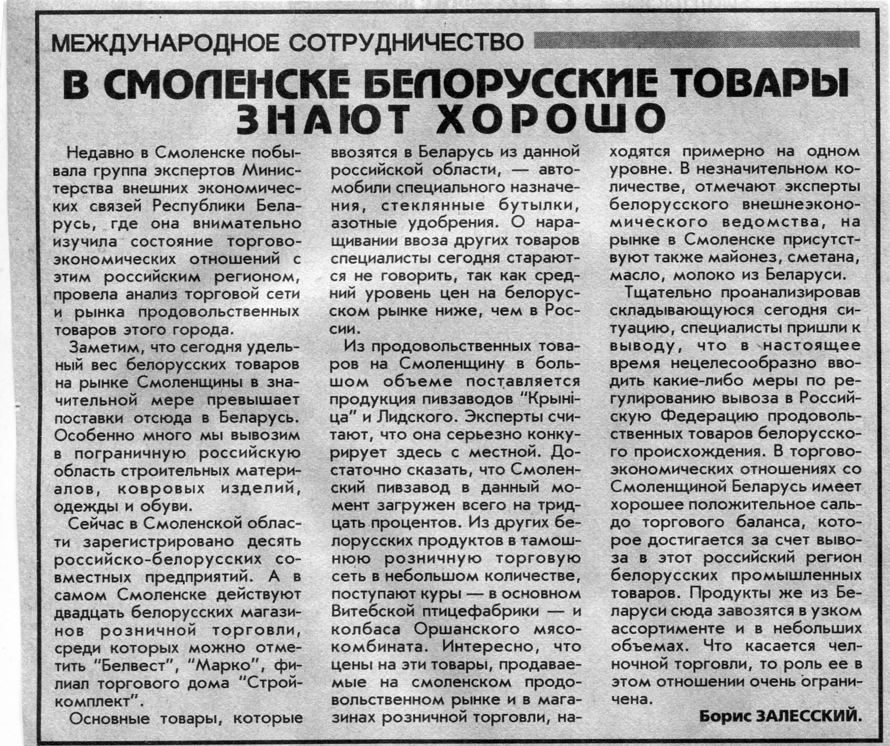 Залесский, Б. В Смоленске белорусские товары знают хорошо / Б. Залесский // Вечерний Минск. - 1998. - 1 сент.