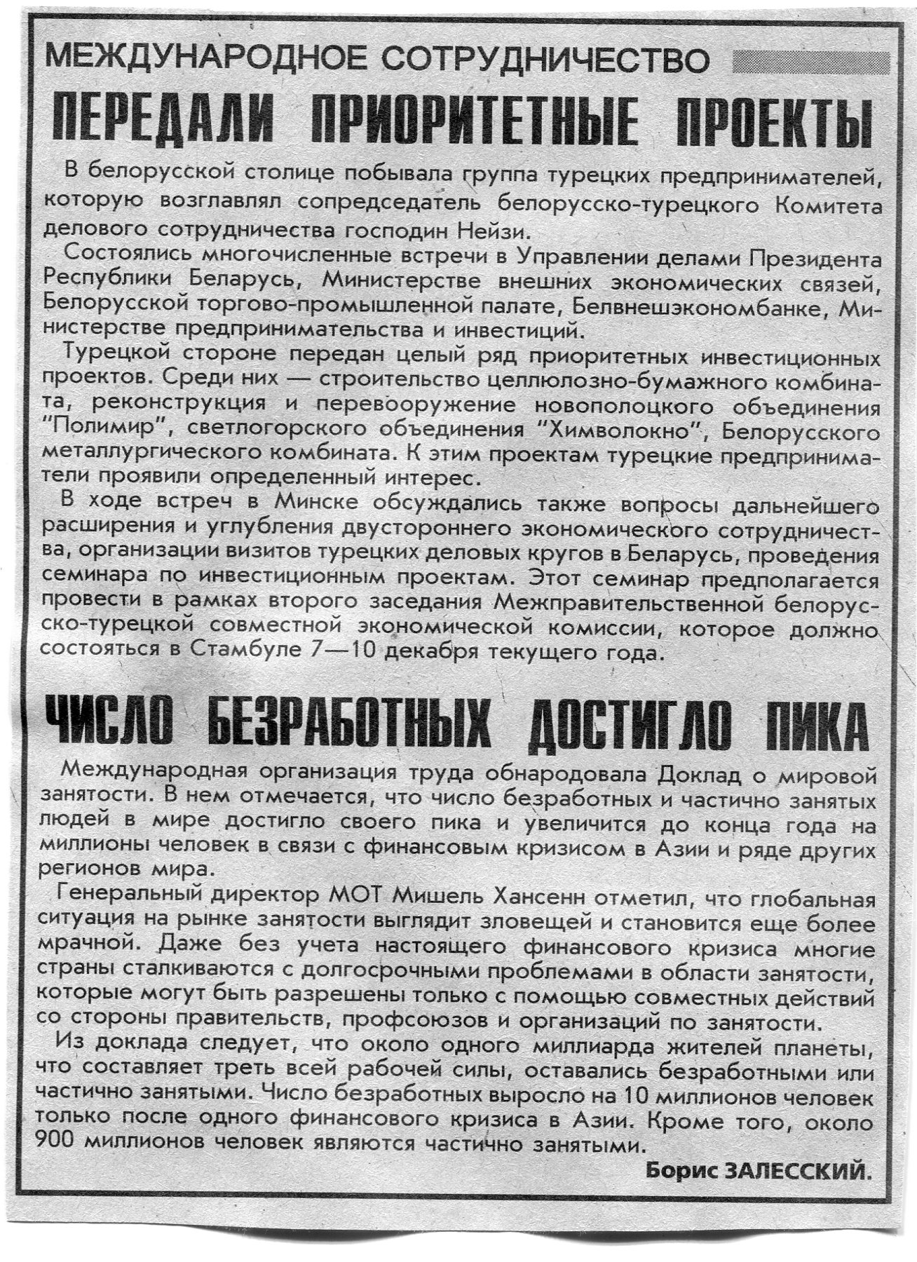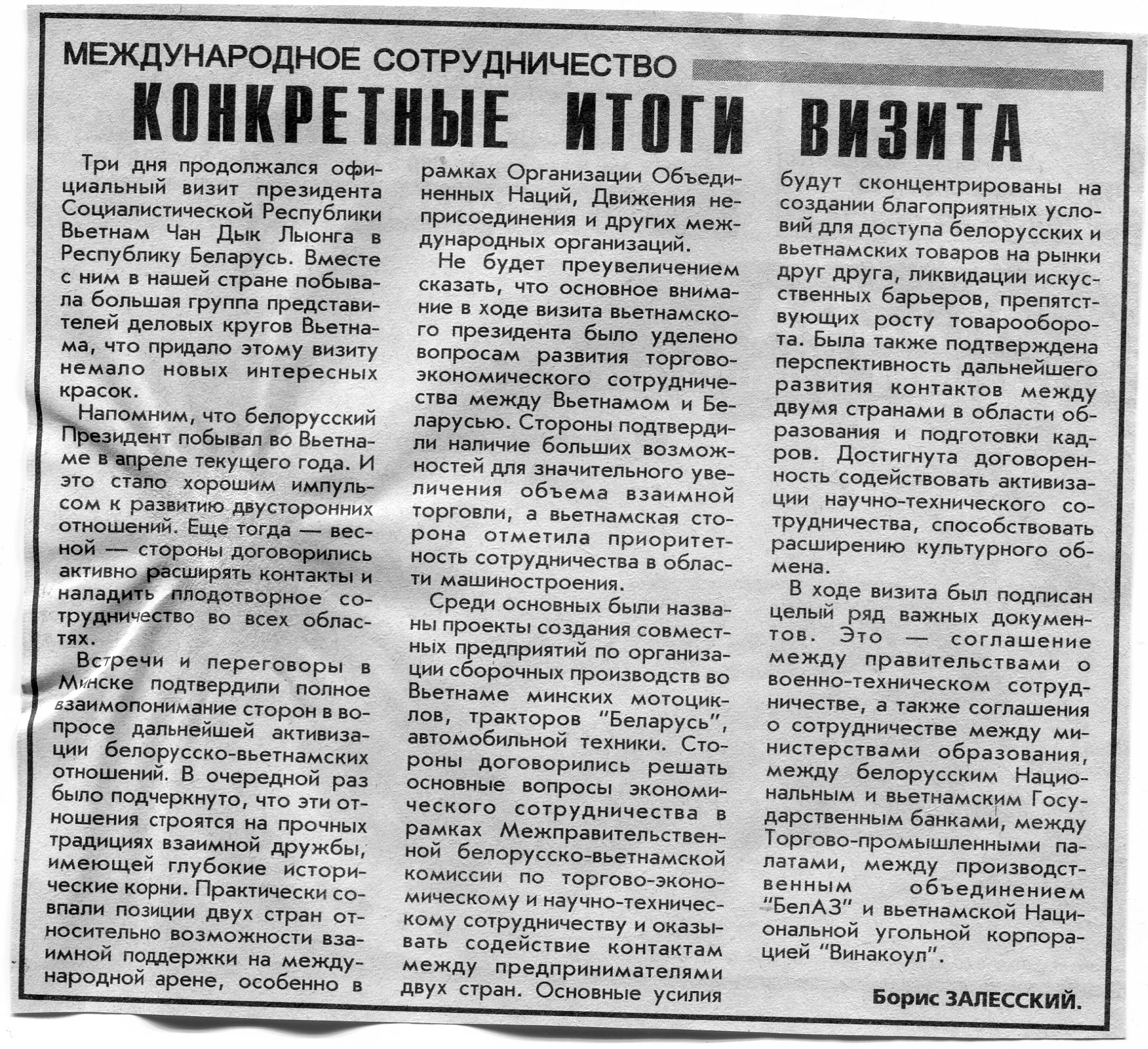Залесский, Б. Конкретные итоги визита / Б. Залесский // Вечерний Минск. - 1998. - 15 сент.