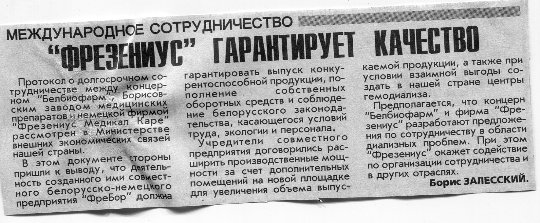 Залесский, Б. "Фрезениус" гарантирует качество / Б. Залесский // Вечерний Минск. - 1998. - 11 авг.