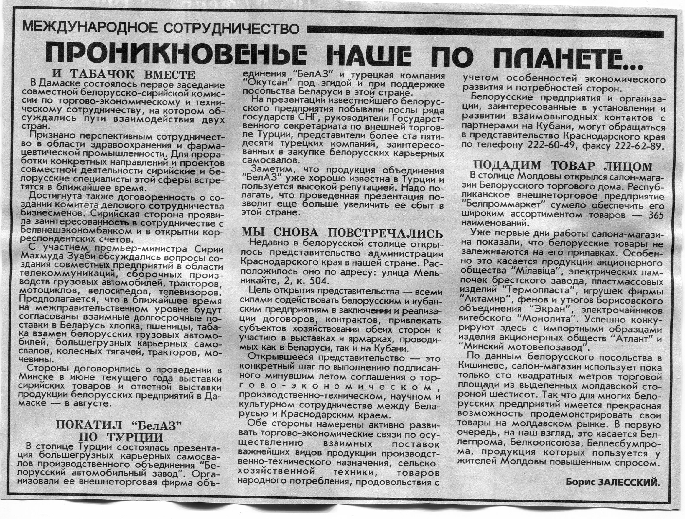 Залесский, Б. Международное сотрудничество / Б. Залесский // Вечерний Минск. - 1997. - 29 дек.