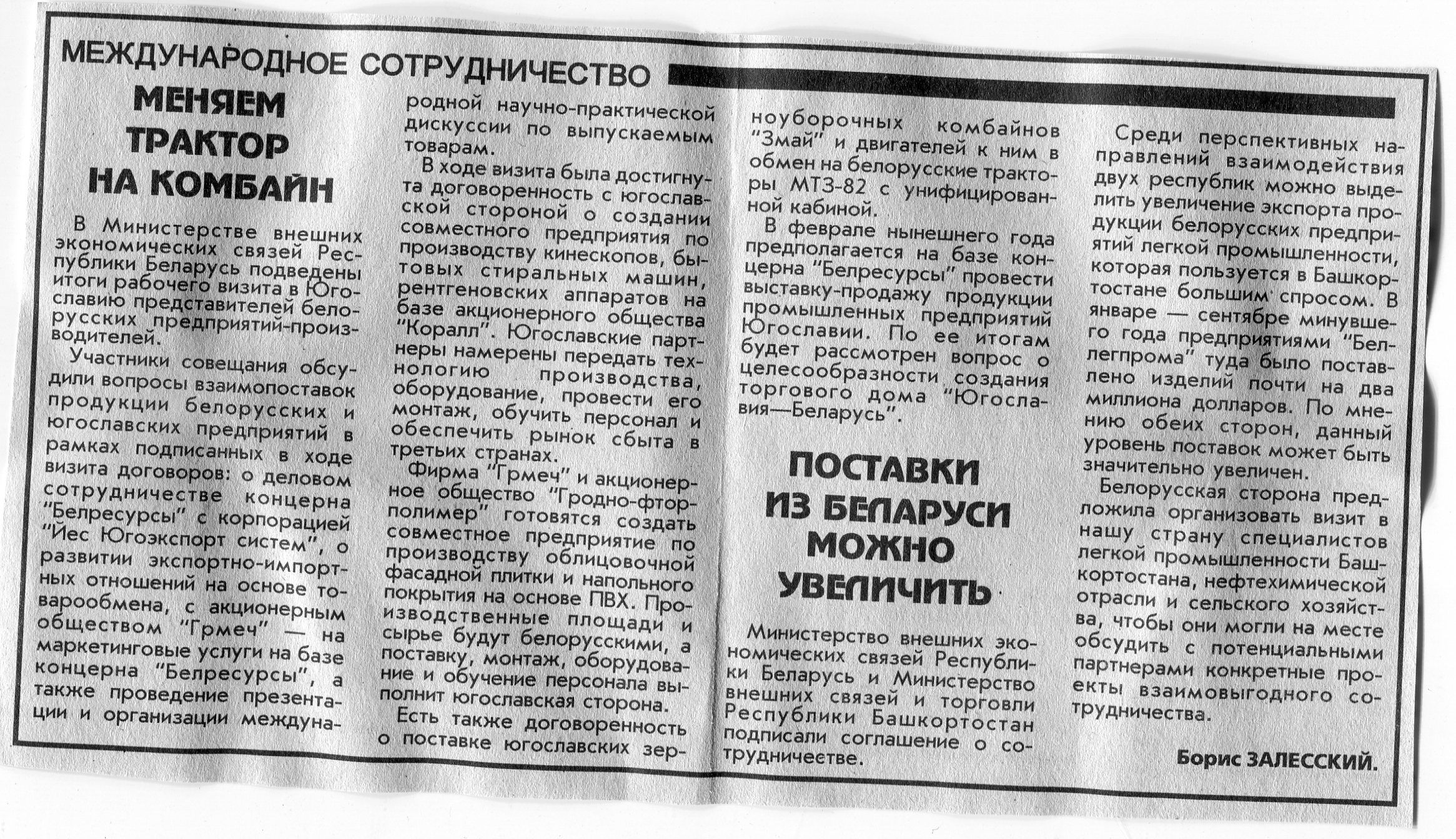 Залесский, Б. Международное сотрудничество / Б. Залесский // Вечерний Минск. - 1998. - 20 янв.