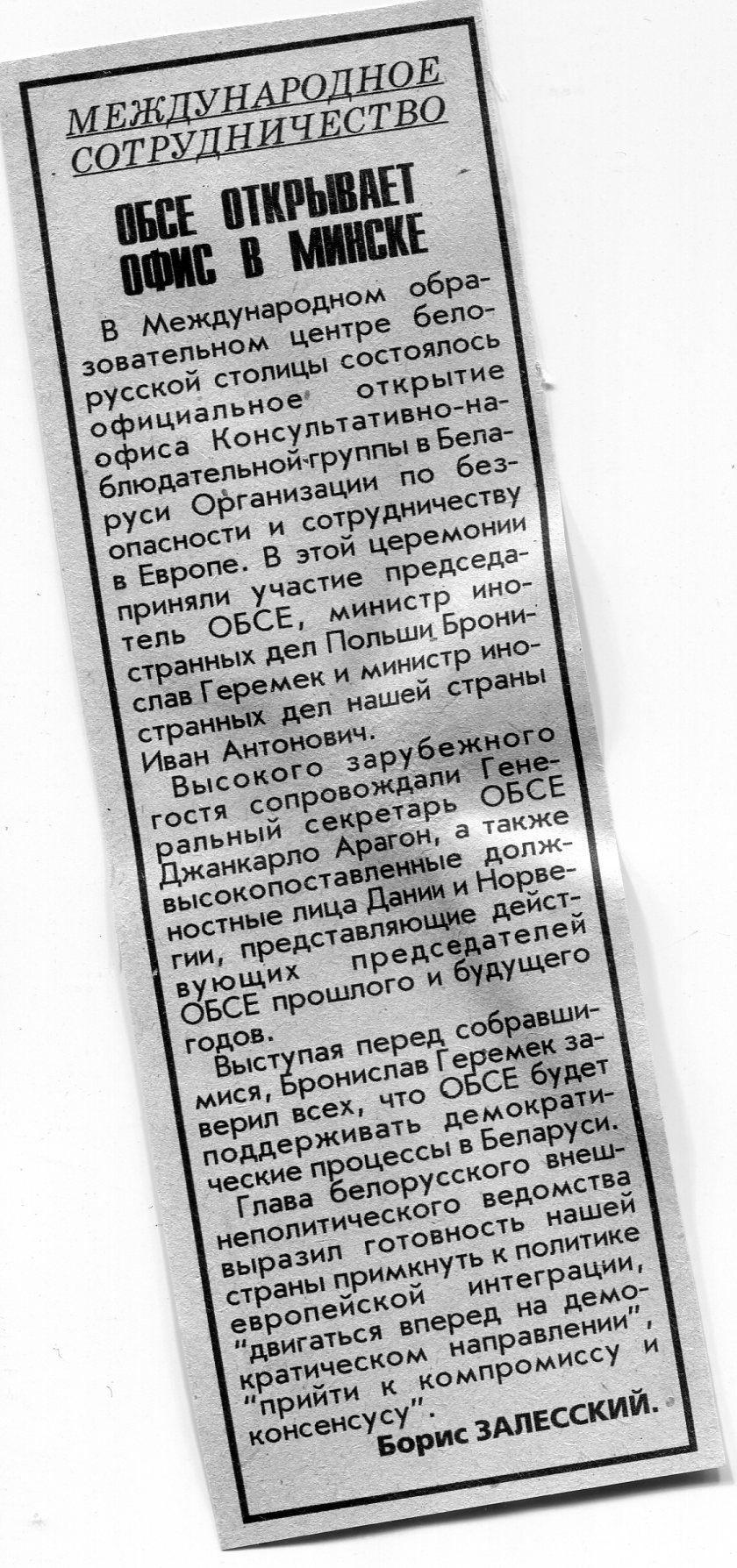 Залесский, Б. ОБСЕ открывает офис в Минске / Б. Залесский // Вечерний Минск. - 1998. - 3 мар.