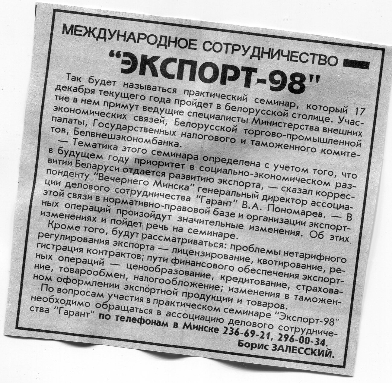 Залесский, Б. "Экспорт-98" / Б. Залесский // Вечерний Минск. - 1997. - 5 дек.