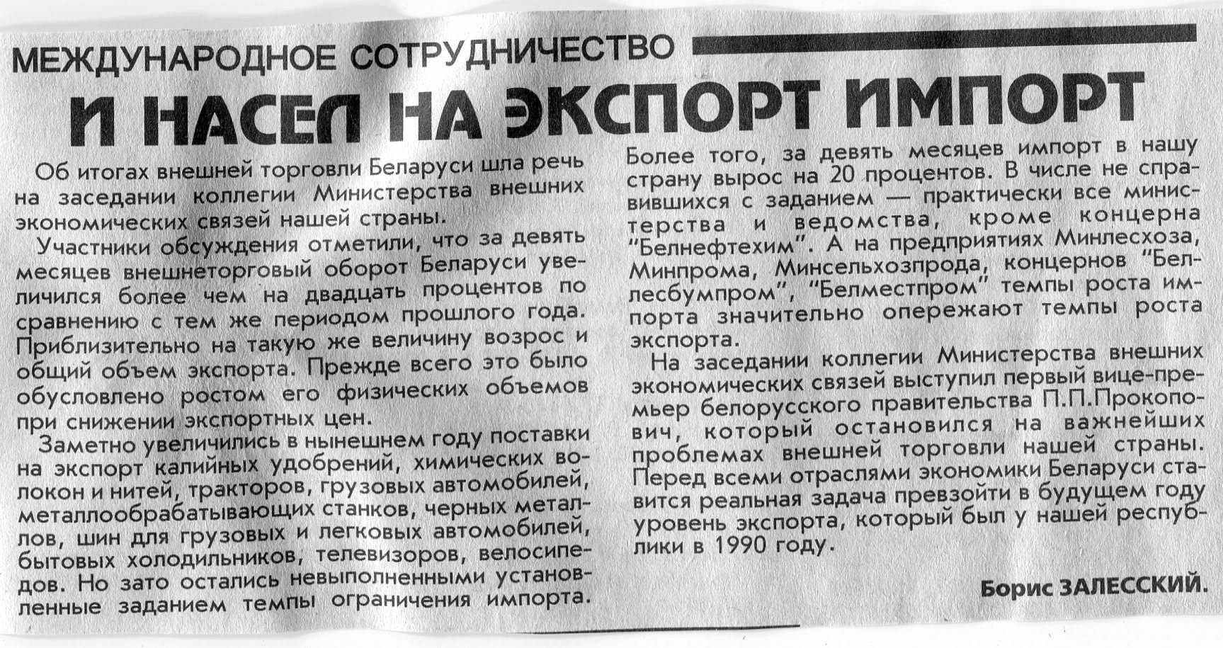 Залесский, Б. И насел на экспорт импорт / Б. Залесский // Вечерний Минск. - 1997. - 25 нояб.