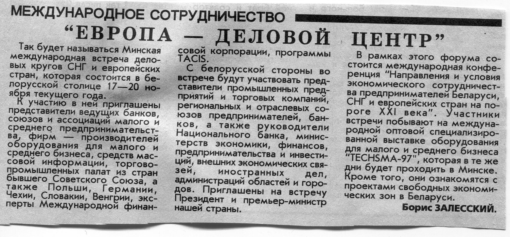 Залесский, Б. "Европа - деловой центр" / Б. Залесский // Вечерний Минск. - 1997. - 8 окт.