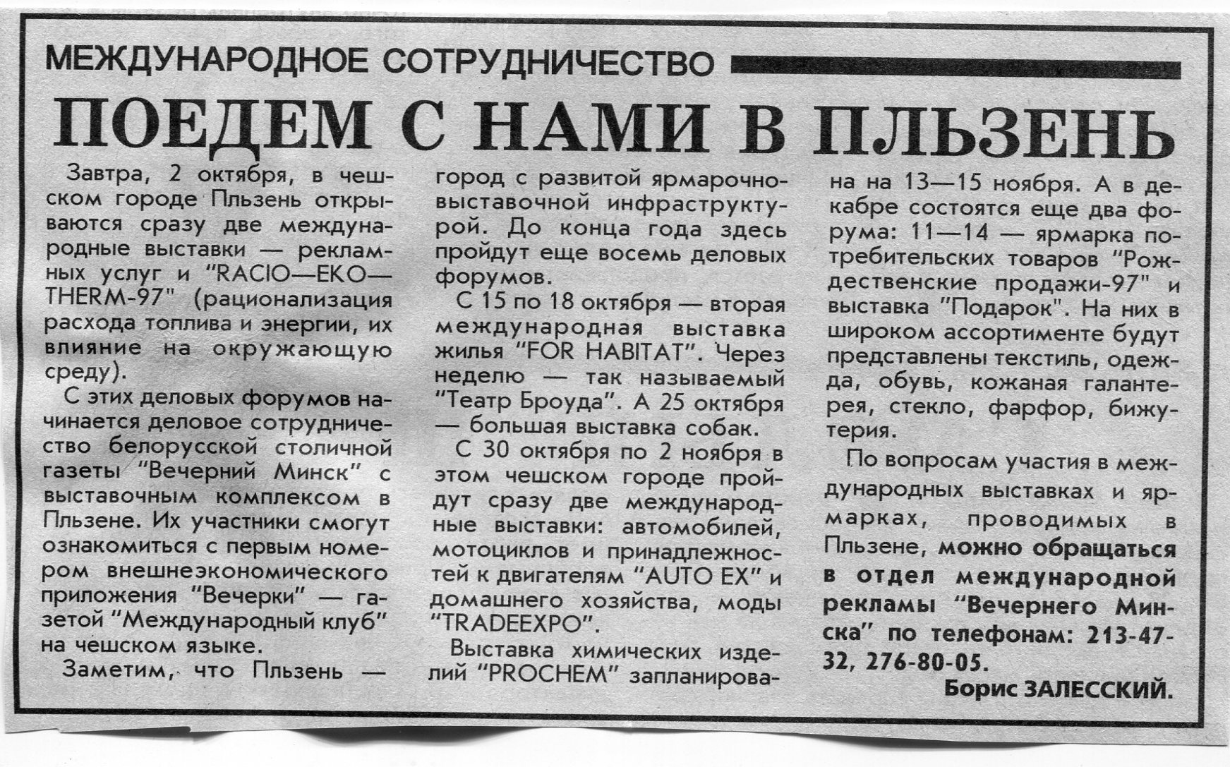 Залесский, Б. Выставки в Праге и белорусский бизнес / Б. Залесский // Вечерний Минск. - 1997. - 3 нояб.