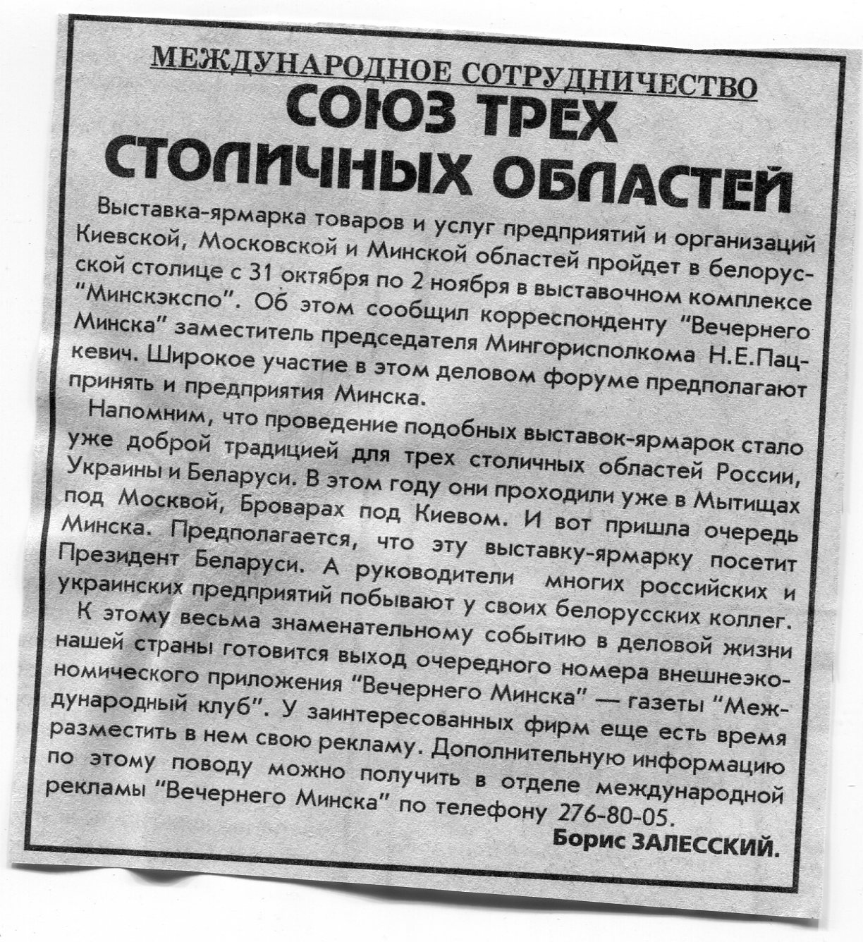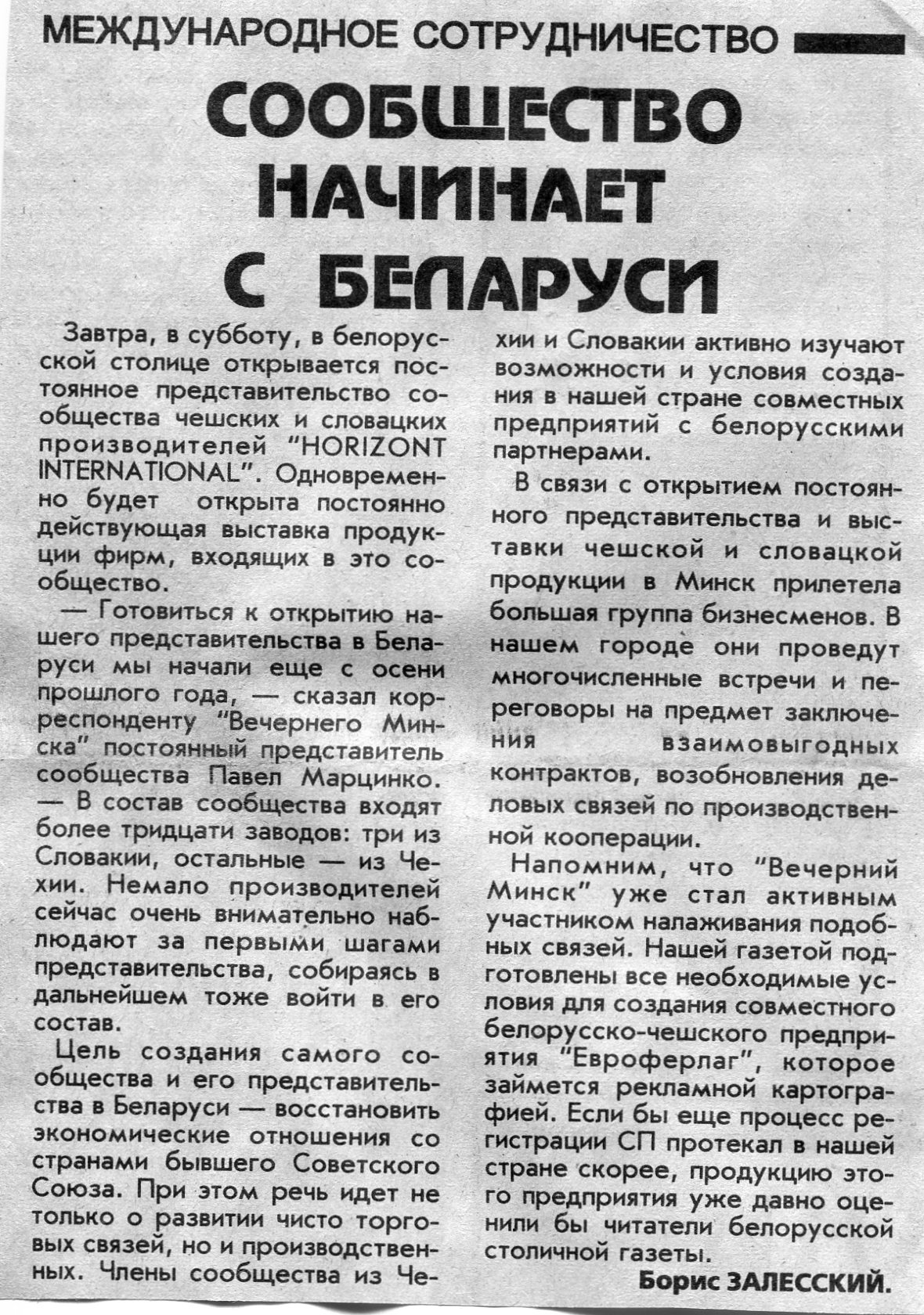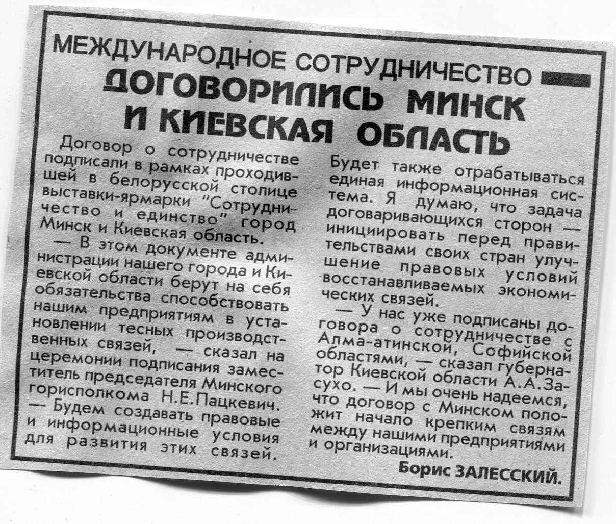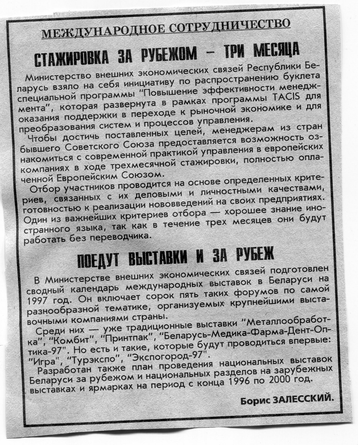 Залесский, Б. Международное сотрудничество / Б. Залесский // Вечерний Минск. - 1996. - 25 нояб.