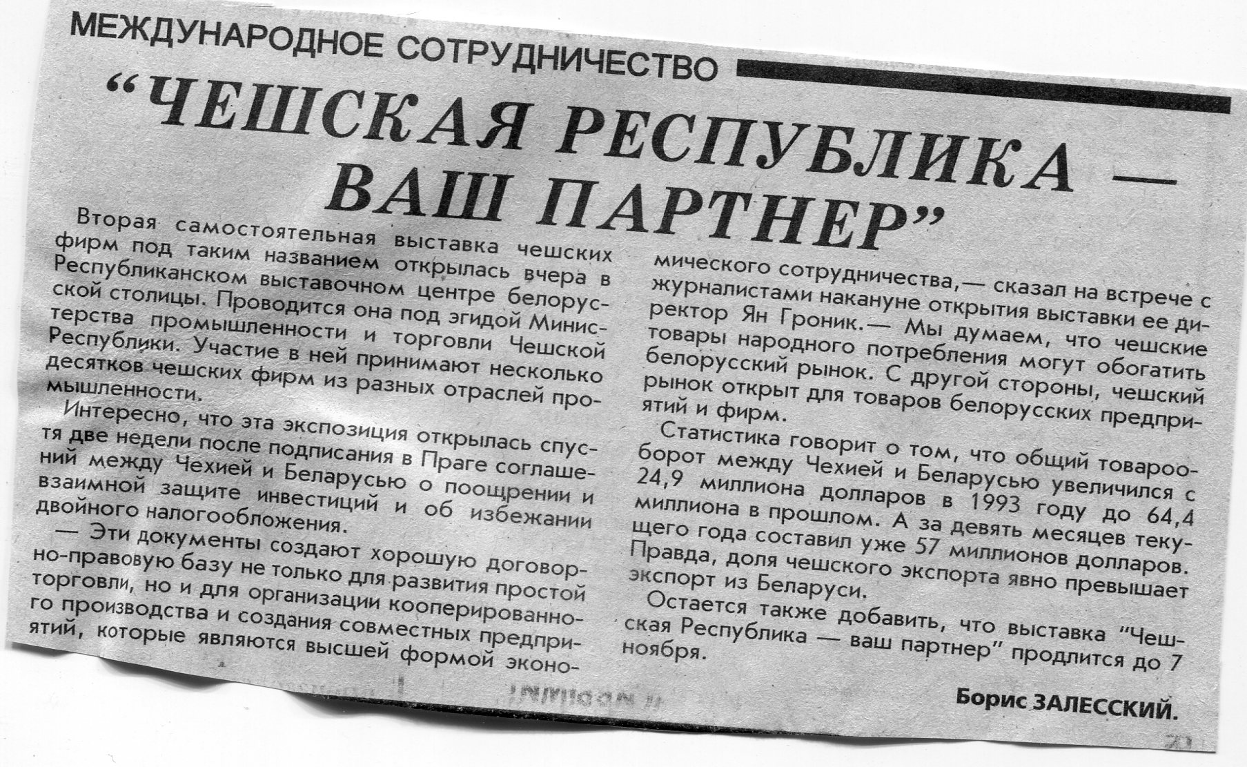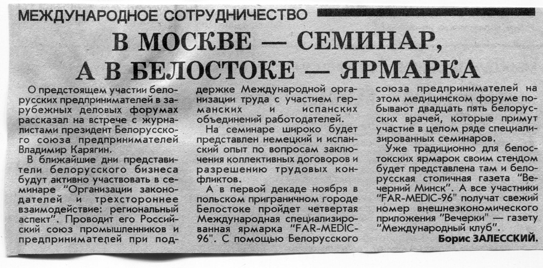 Залесский, Б. "Бизнес без границ" / Б. Залесский // Вечерний Минск. - 1996. - 9 сент.