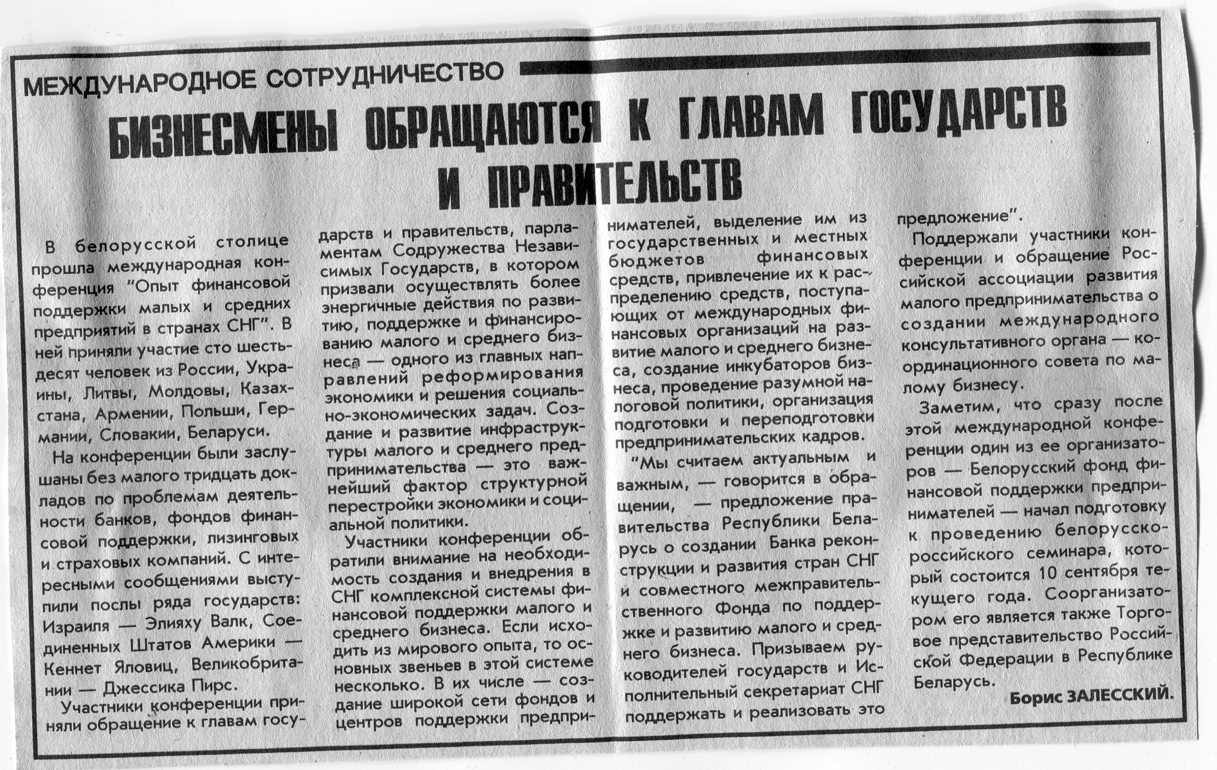 Залесский, Б. Бизнесмены обращаются к главам государств и правительств / Б. Залесский // Вечерний Минск. - 1996. - 24 июл.