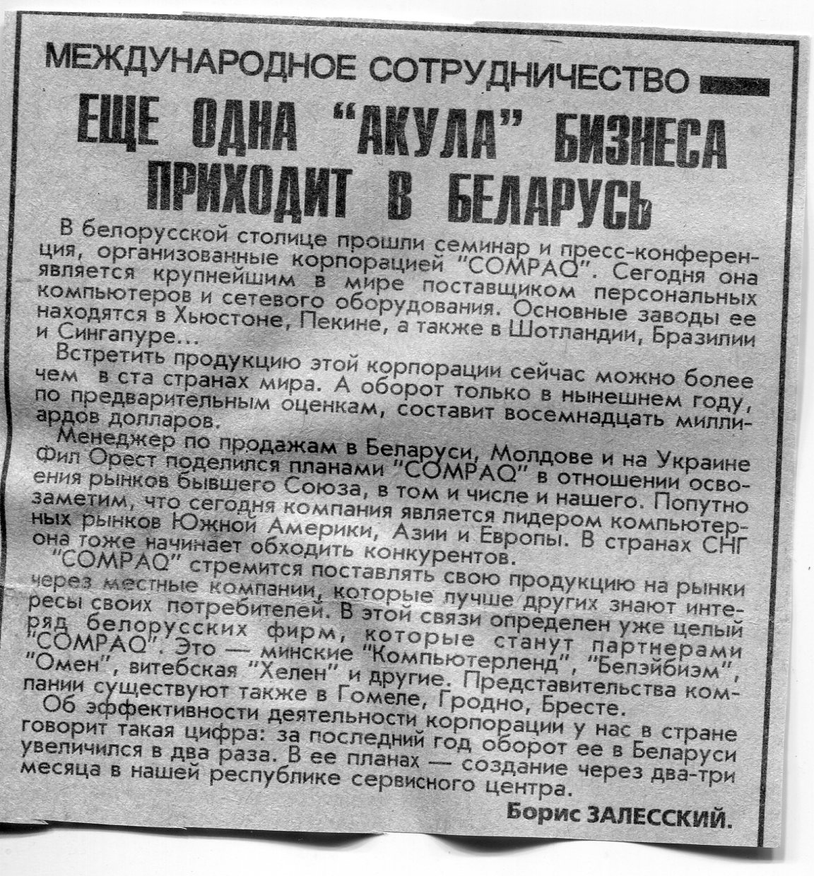 Залесский, Б. Еще одна "акула" бизнеса приходит в Беларусь / Б. Залесский // Вечерний Минск. - 1996.- 25 сент.