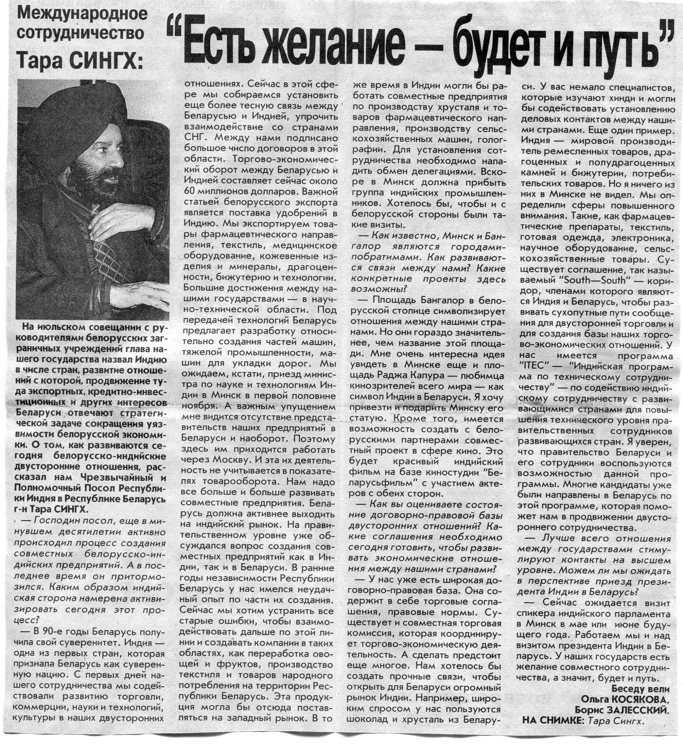 Залесский, Б. Тара Сингх: "Есть желание - будет и путь" / Б. Залесский, О. Косякова // Вечерний Минск. - 2004. - 29 окт.