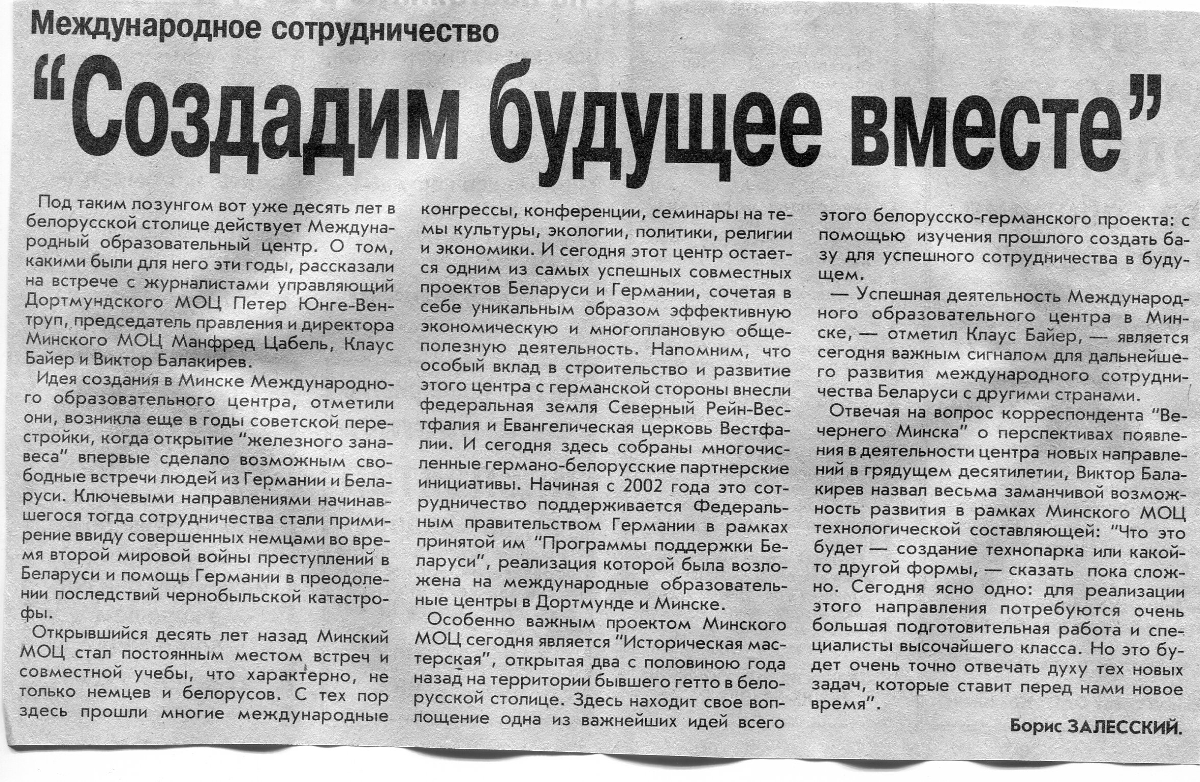 Залесский, Б. "Создадим будущее вместе" / Б. Залесский // Вечерний Минск. - 2004. - 17 нояб.