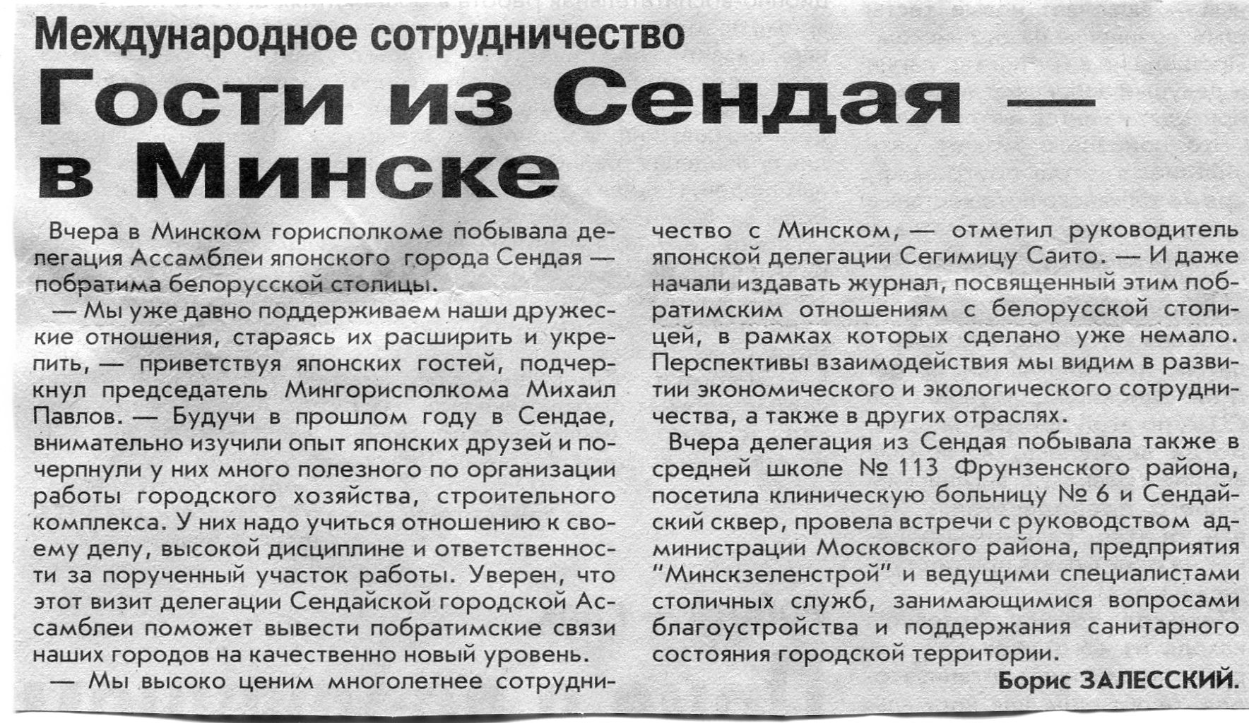 Залесский, Б. Гости из Сендая - в Минске / Б. Залесский // Вечерний Минск. - 2004. - 13 окт.