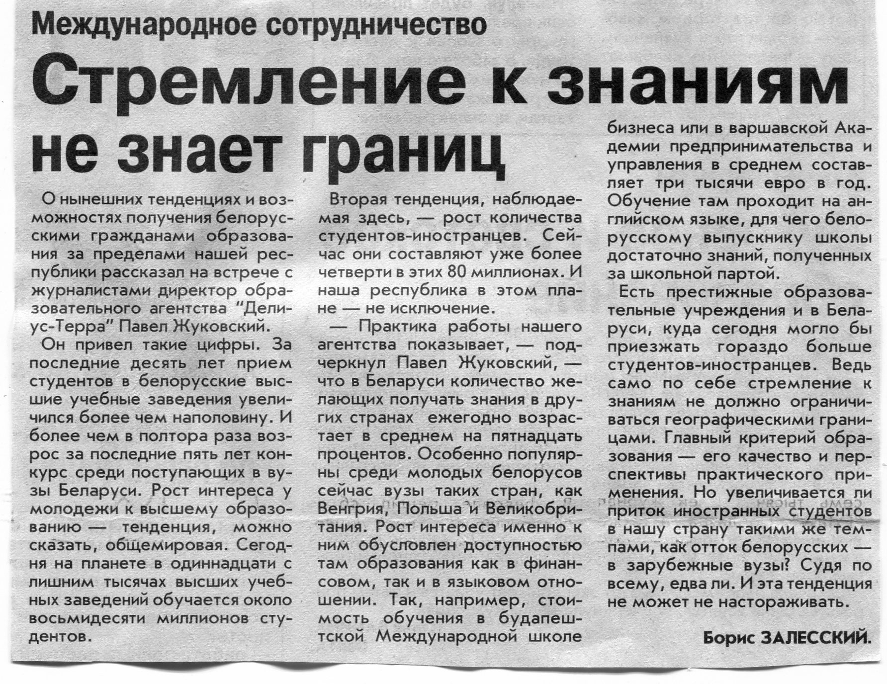 Залесский, Б. Стремление к знаниям не знает границ / Б. Залесский // Вечерний Минск. – 2004. - 3 сент.