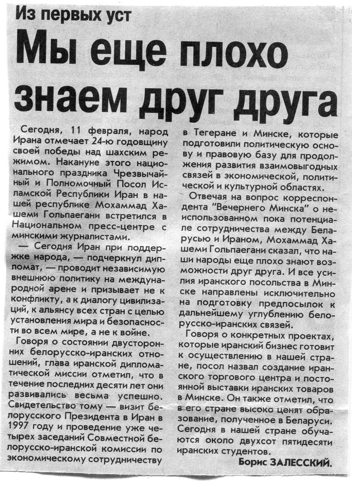 Залесский, Б. Мы еще плохо знаем друг друга / Б. Залесский // Вечерний Минск. - 2002. - 11 февр.