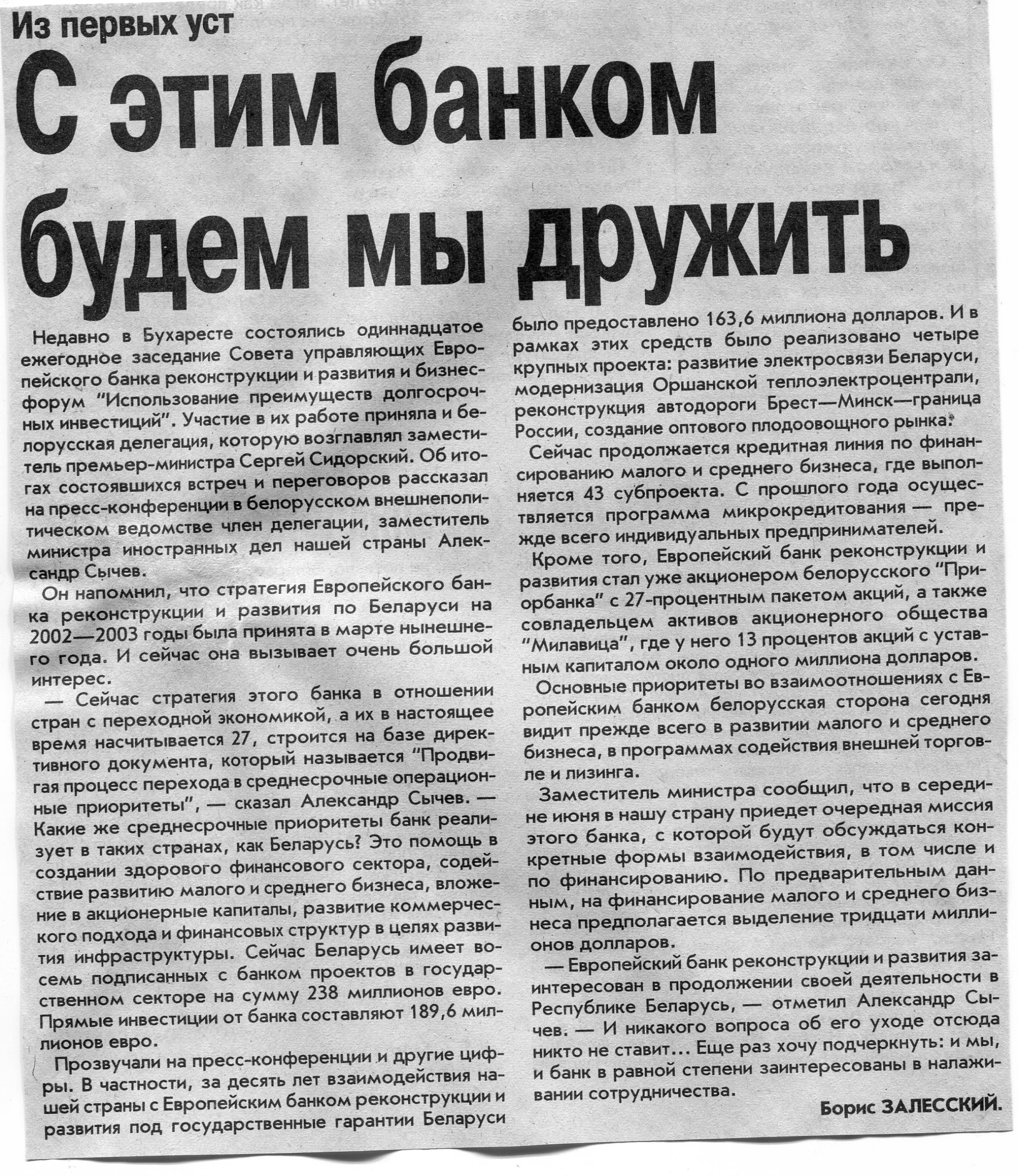 Залесский, Б. С этим банком будем мы дружить / Б. Залесский // Вечерний Минск. – 2002. – 6 июн.