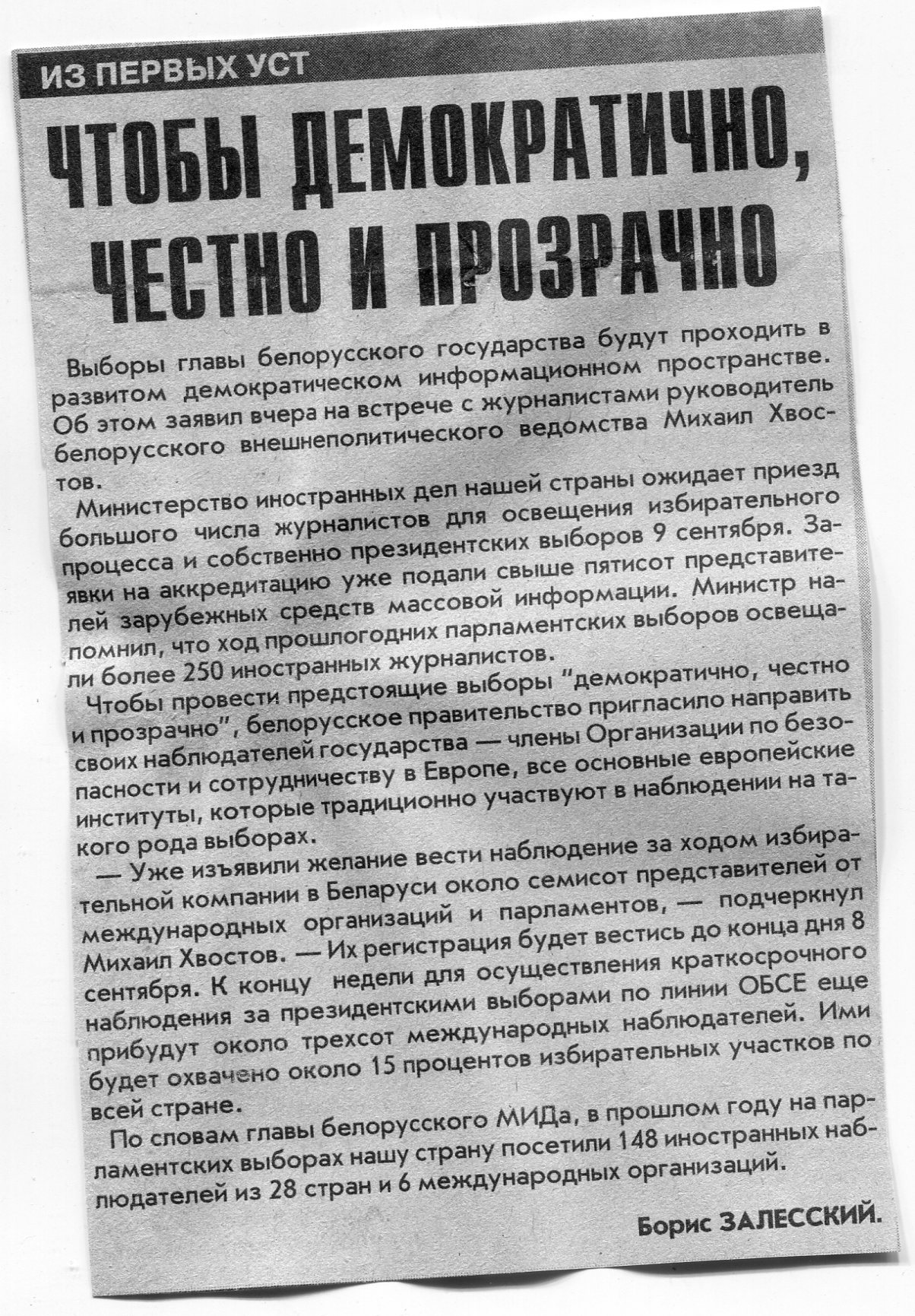 Залесский, Б. Чтобы демократично, честно и прозрачно / Б. Залесский // Вечерний Минск. - 2001. - 7 сент.
