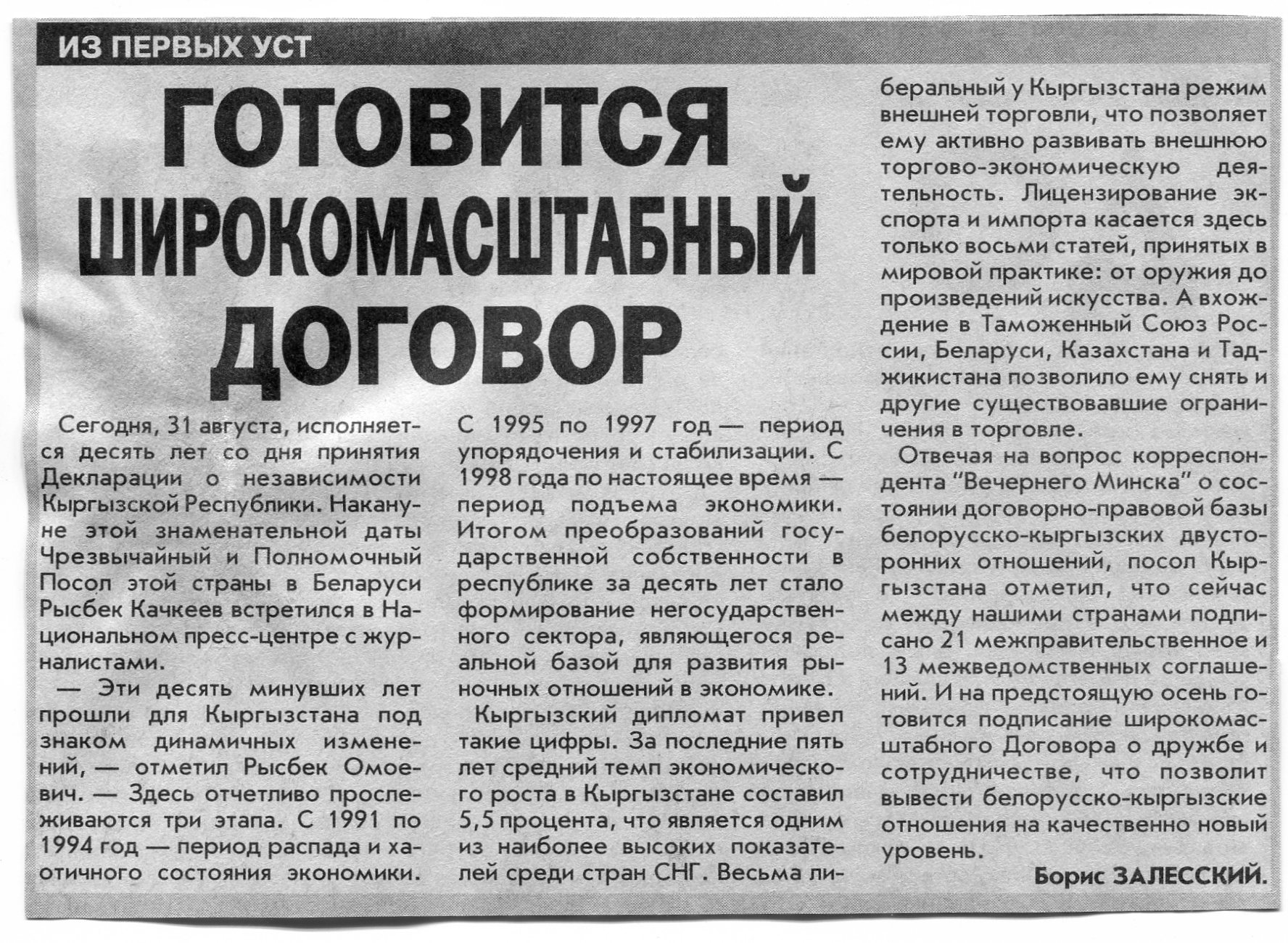 Залесский, Б. Готовится широкомасштабный договор / Б. Залесский // Вечерний Минск. - 2001. - 31 авг.