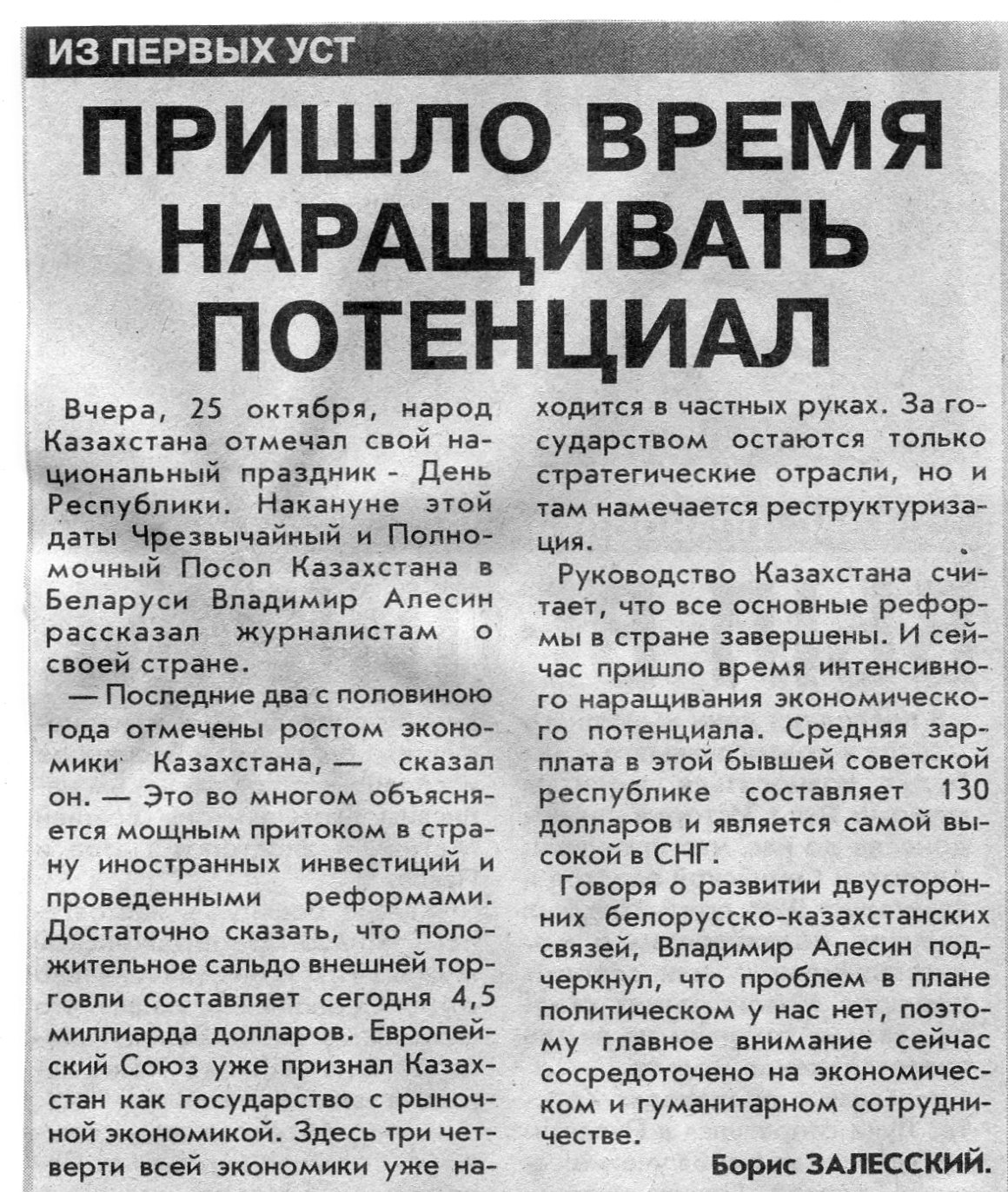 Залесский, Б. Пришло время наращивать потенциал / Б. Залесский // Вечерний Минск. - 2001. - 26 окт.