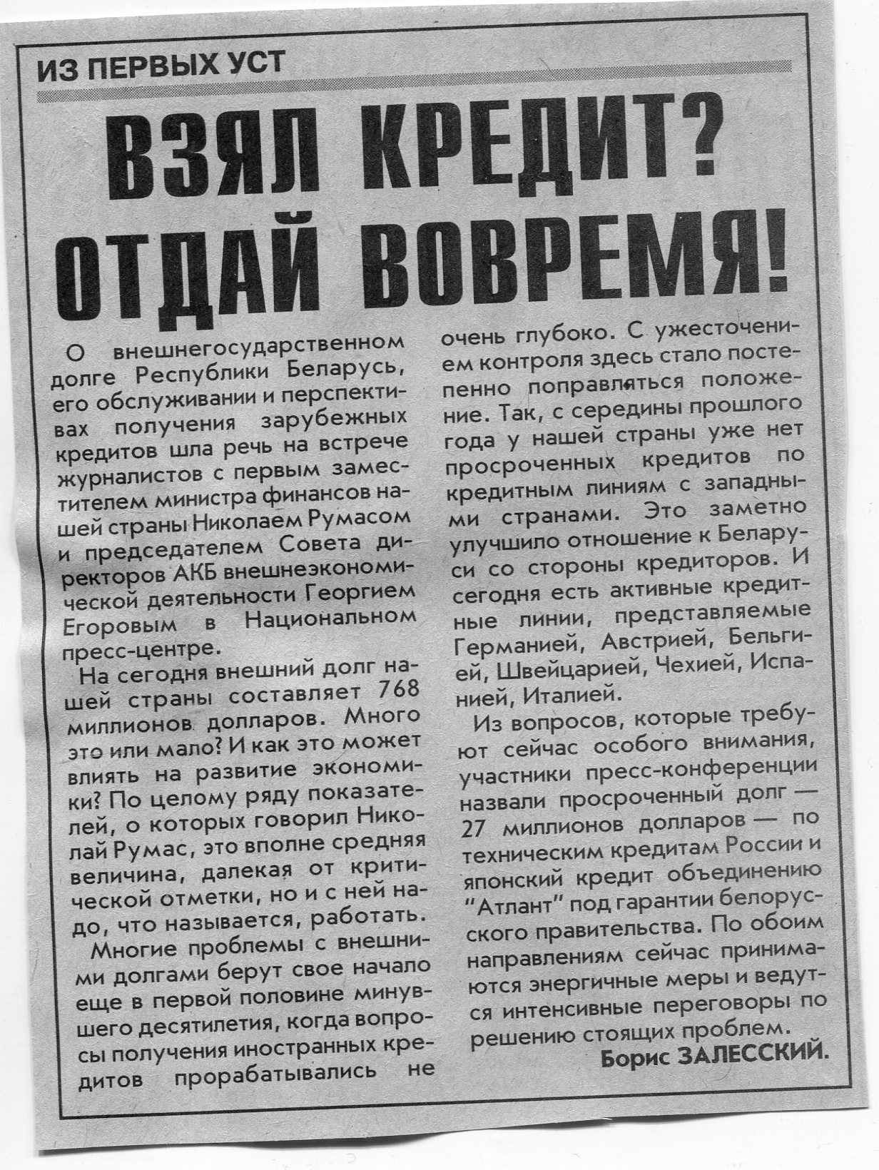 Залесский, Б. Взял кредит? Отдай вовремя! / Б. Залесский // Вечерний Минск. - 2001. - 4 июн.
