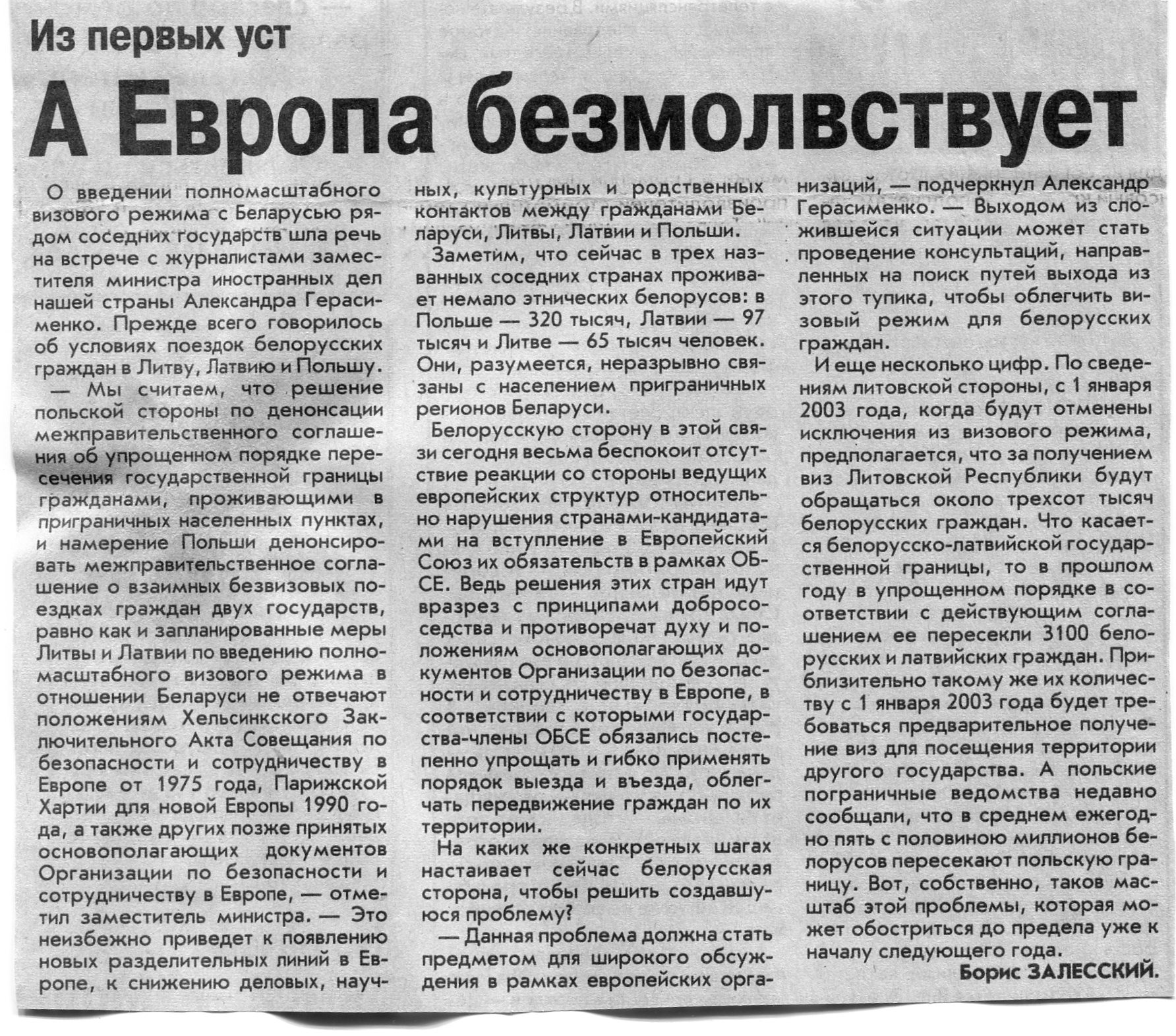 Залесский, Б. А Европа безмолвствует / Б. Залесский // Вечерний Минск. – 2002. – 20 июн.