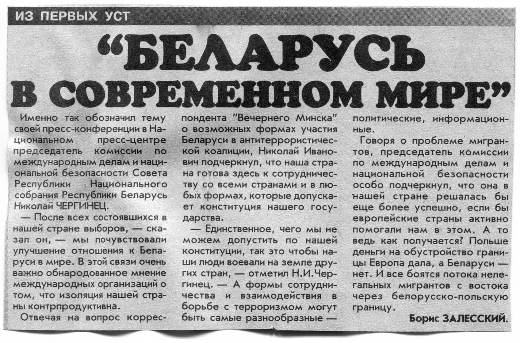 Залесский, Б. "Беларусь в современном мире" / Б. Залесский // Вечерний Минск. - 2001. - 12 нояб.