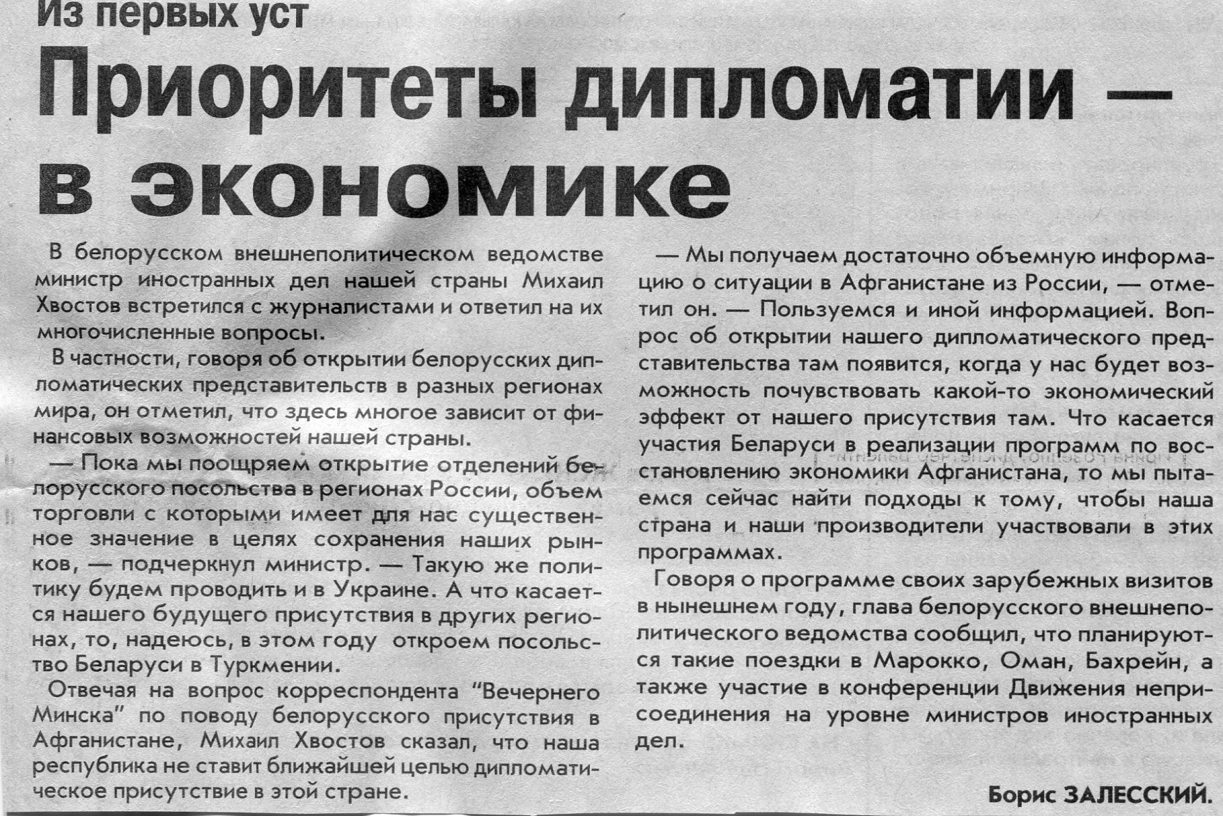 Залесский, Б. Приоритеты дипломатии - в экономике / Б. Залесский // Вечерний Минск. - 2002. - 4 апр.