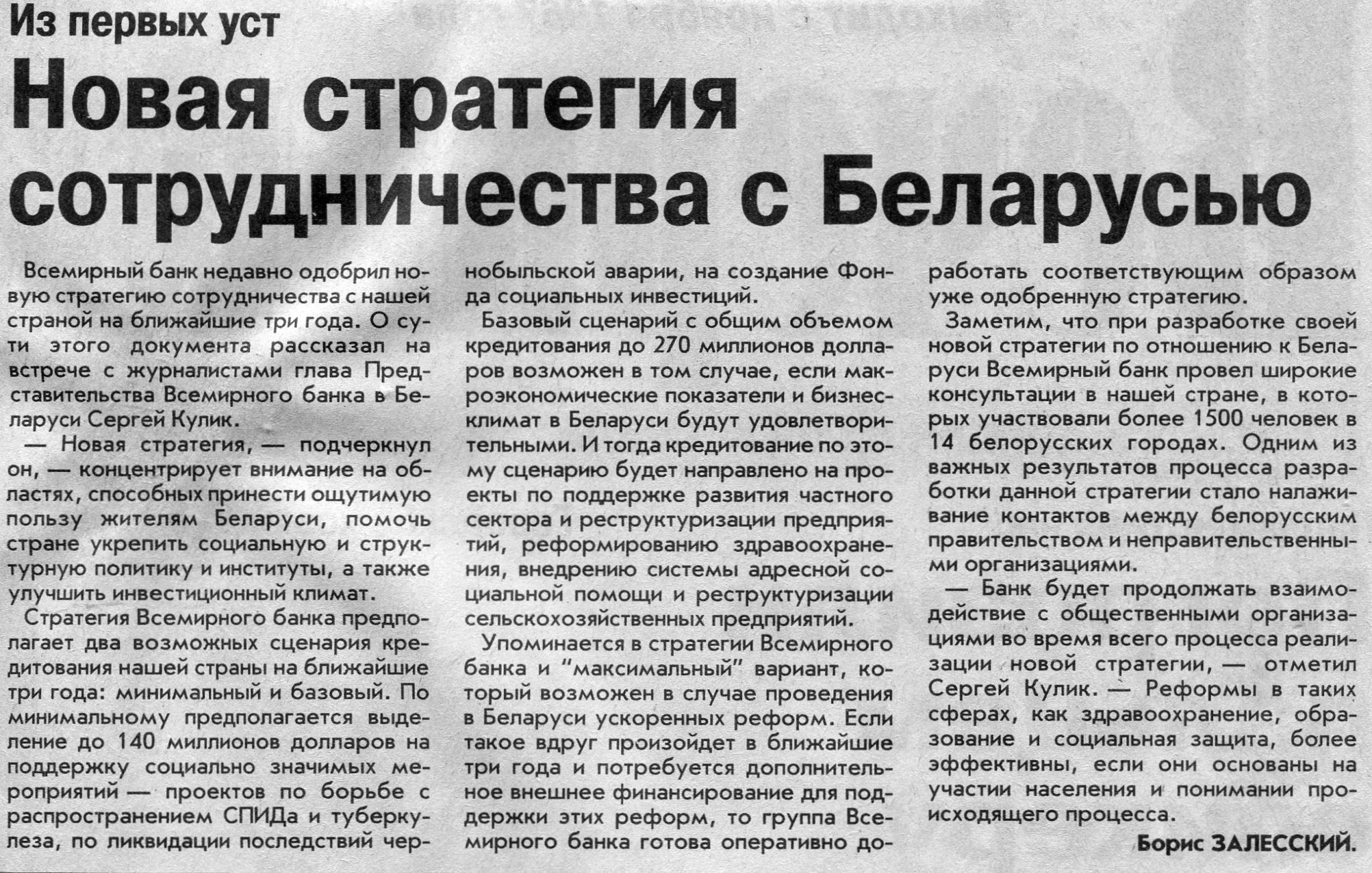 Залесский, Б. Новая стратегия сотрудничества с Беларусью / Б. Залесский // Вечерний Минск. - 2002. - 3 апр.
