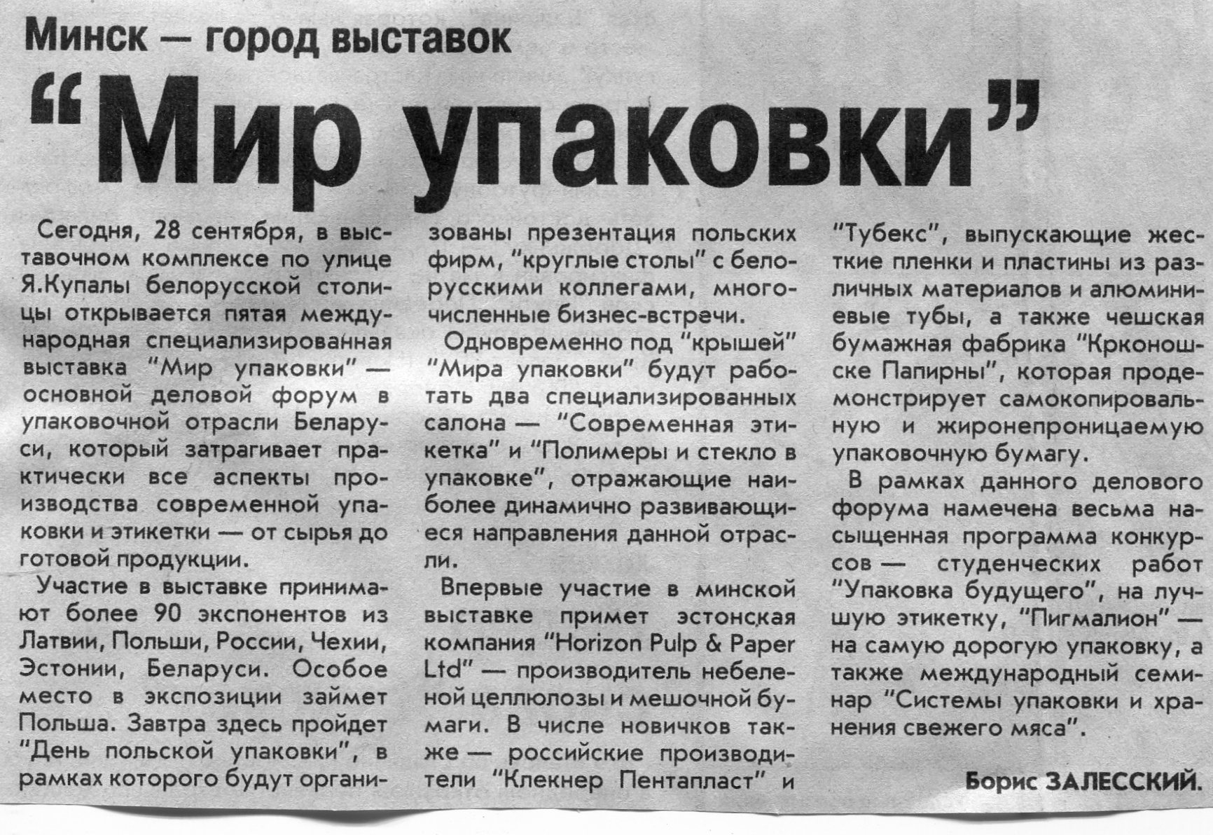 Залесский, Б. "Мир упаковки" / Б. Залесский // Вечерний Минск. – 2004. - 28 сент.