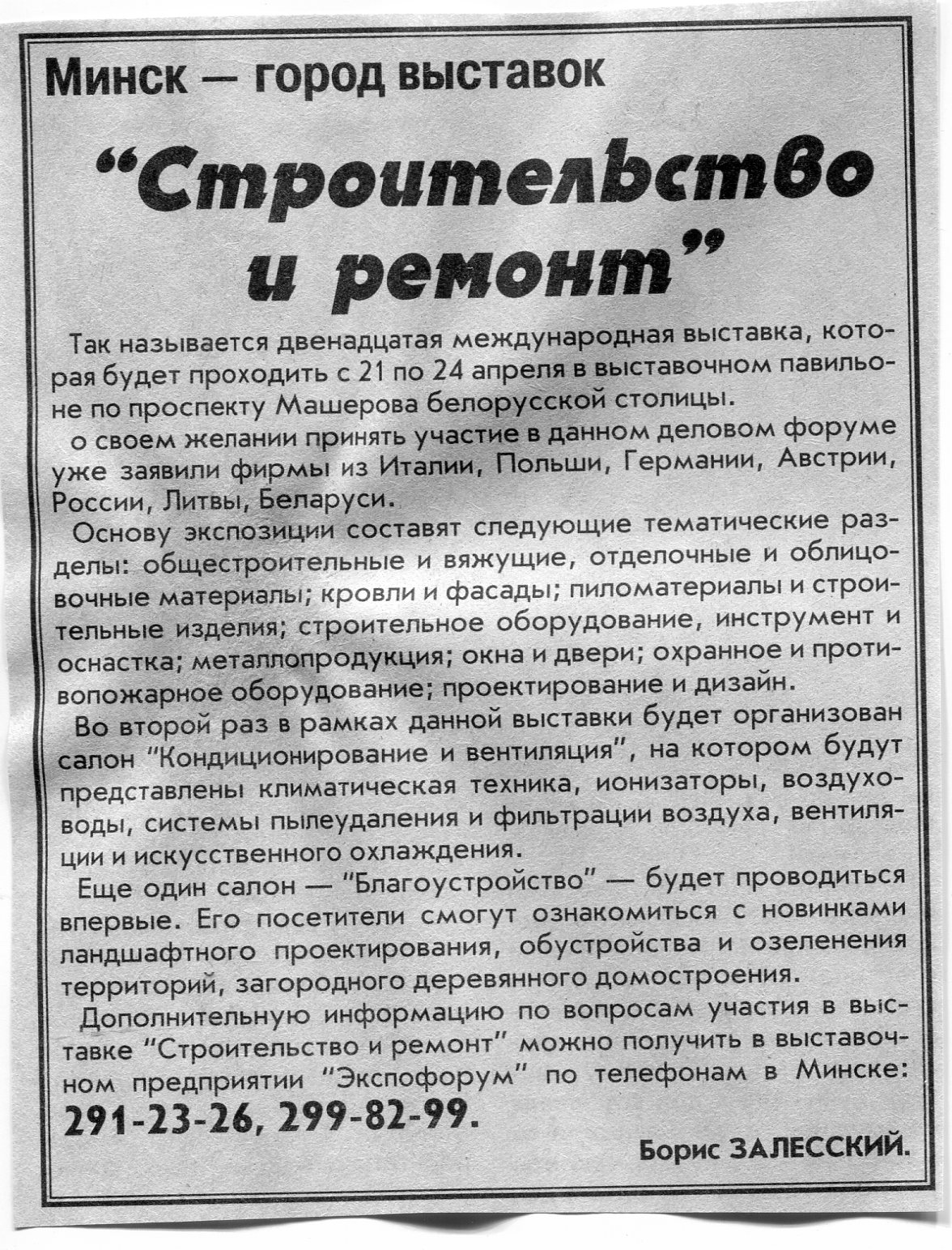 Залесский, Б. "Строительство и ремонт" / Б. Залесский // Вечерний Минск. – 2004. - 15 апр.