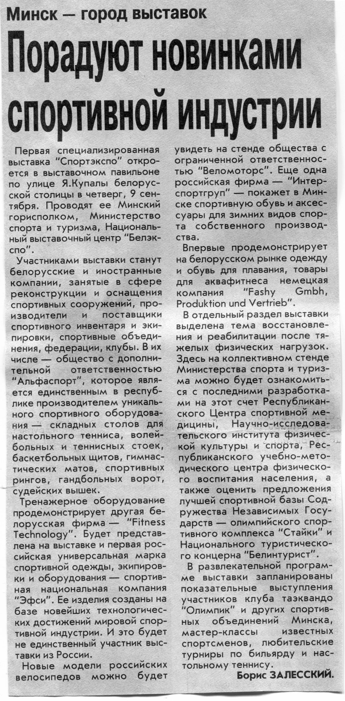 Залесский, Б. Порадуют новинками спортивной индустрии / Б. Залесский // Вечерний Минск. – 2004. - 7 сент.