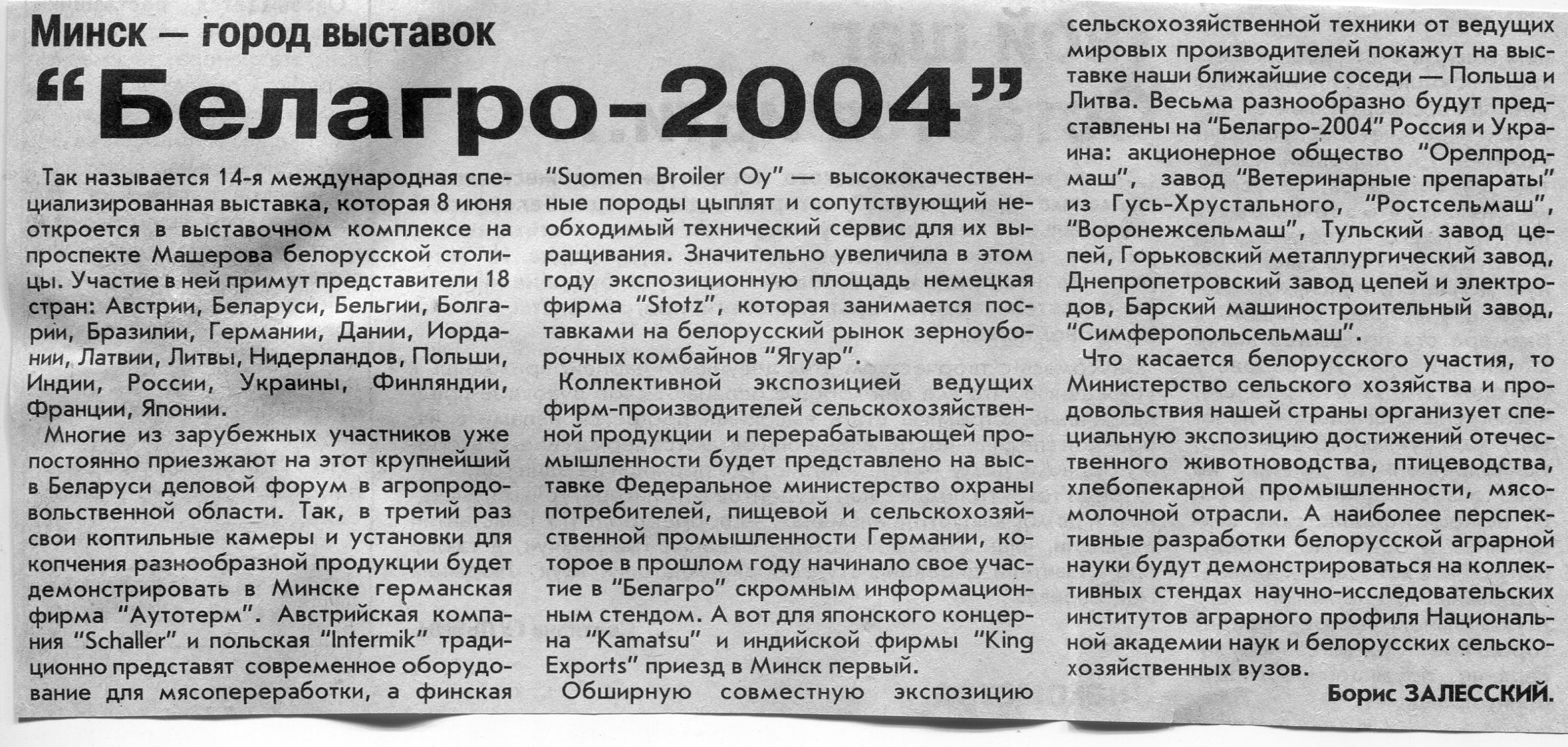 Залесский, Б. "Белагро-2004" / Б. Залесский // Вечерний Минск. – 2004. - 2 июн.