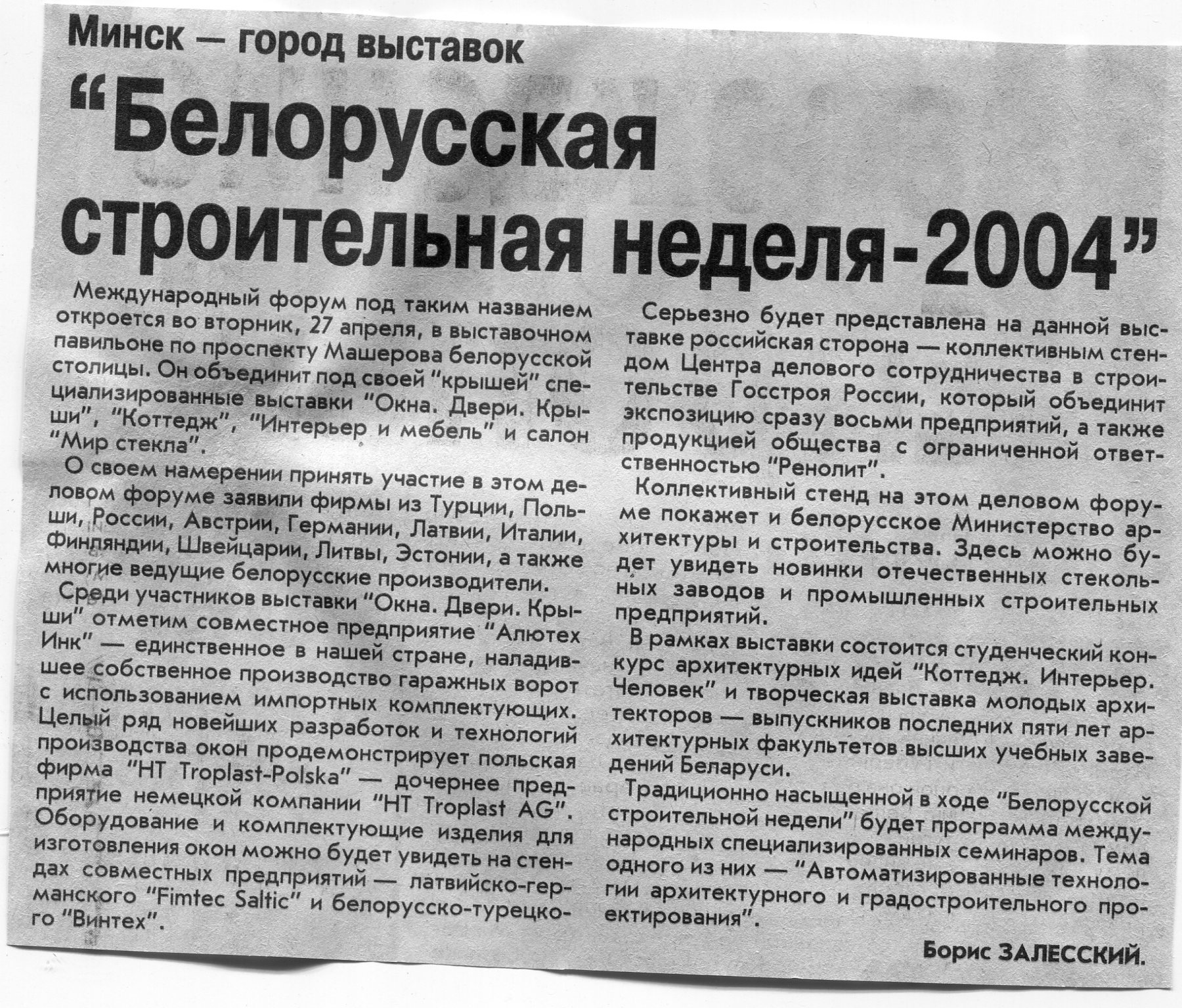 Залесский, Б. "Белорусская строительная неделя-2004" / Б. Залесский // Вечерний Минск. – 2004. - 26 апр.
