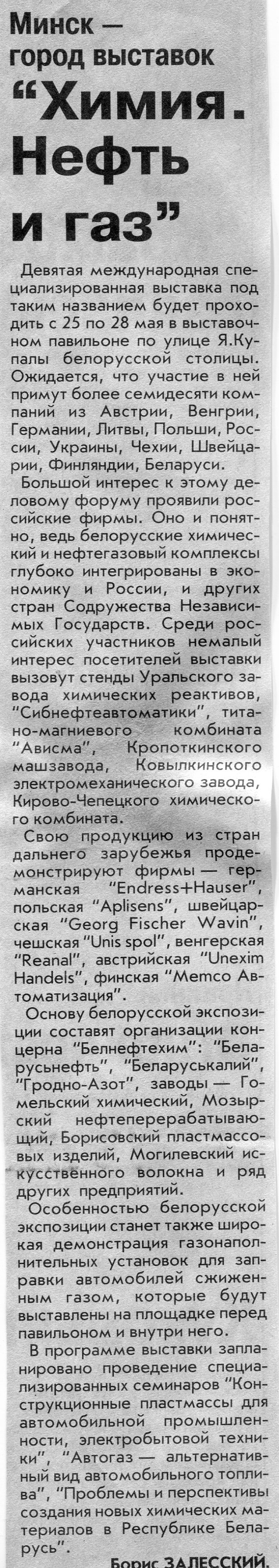Залесский, Б. "Химия. Нефть и газ" / Б. Залесский // Вечерний Минск. – 2004. - 17 мая.